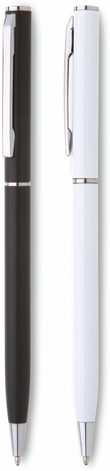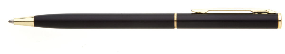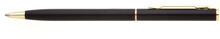Tenká černá propiska s otočným mechanismem a zlatými doplňky o rozměrech 130 x 7,5 mm. Materiál hliník, náplň modře píšící.