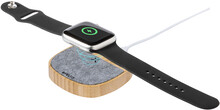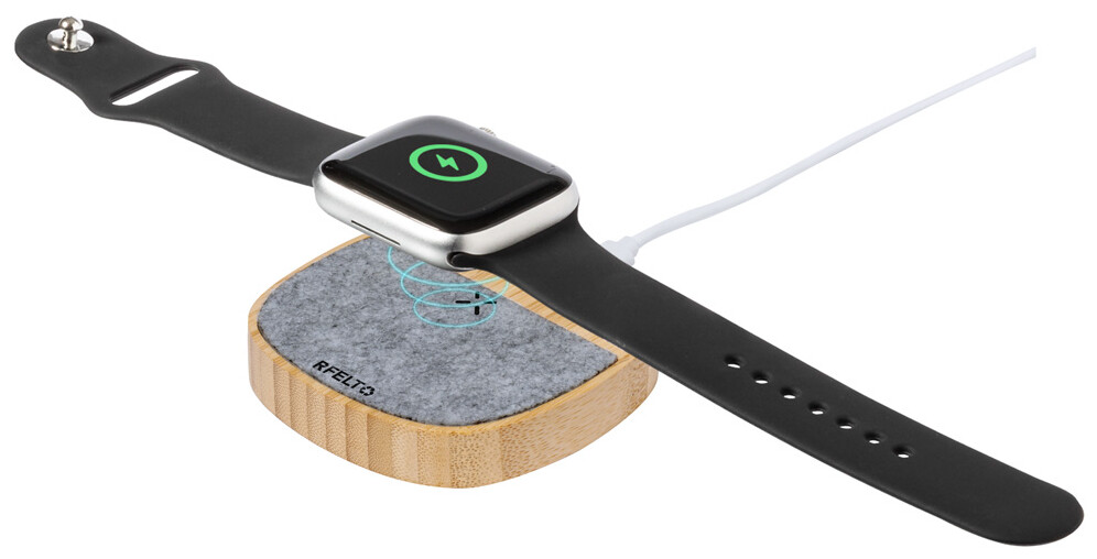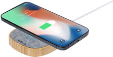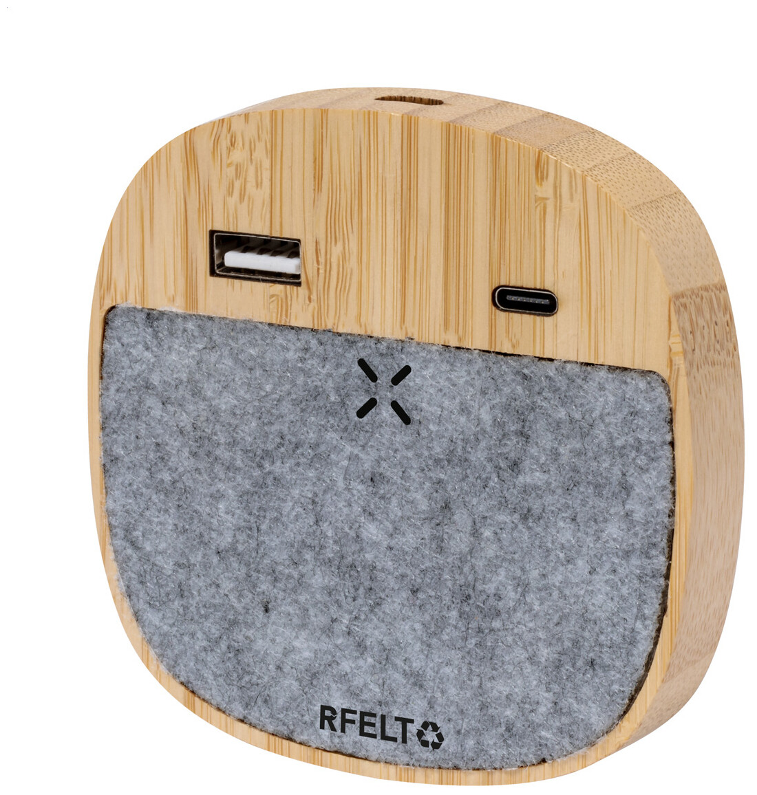 Bezdrátová rychlonabíječka (15W) v pouzdru z bambusu a RPET plsti. S 1 USB a 1 USB-C nabíjecím portem pro současné kabelové a bezdrátové nabíjení. Včetně USB nabíjecího kabelu.
