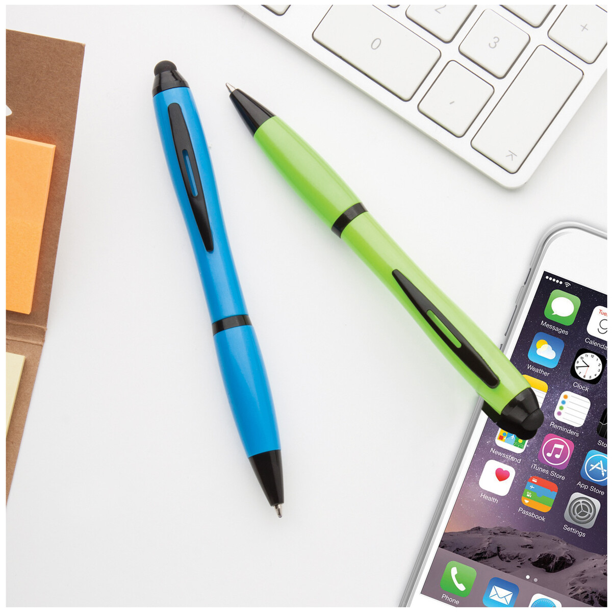 Plastové kuličkové a dotykové pero s barevným tělem a černými částmi, s modrou náplní.