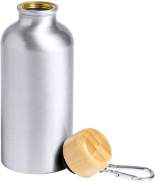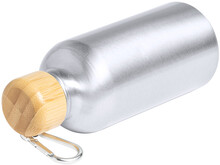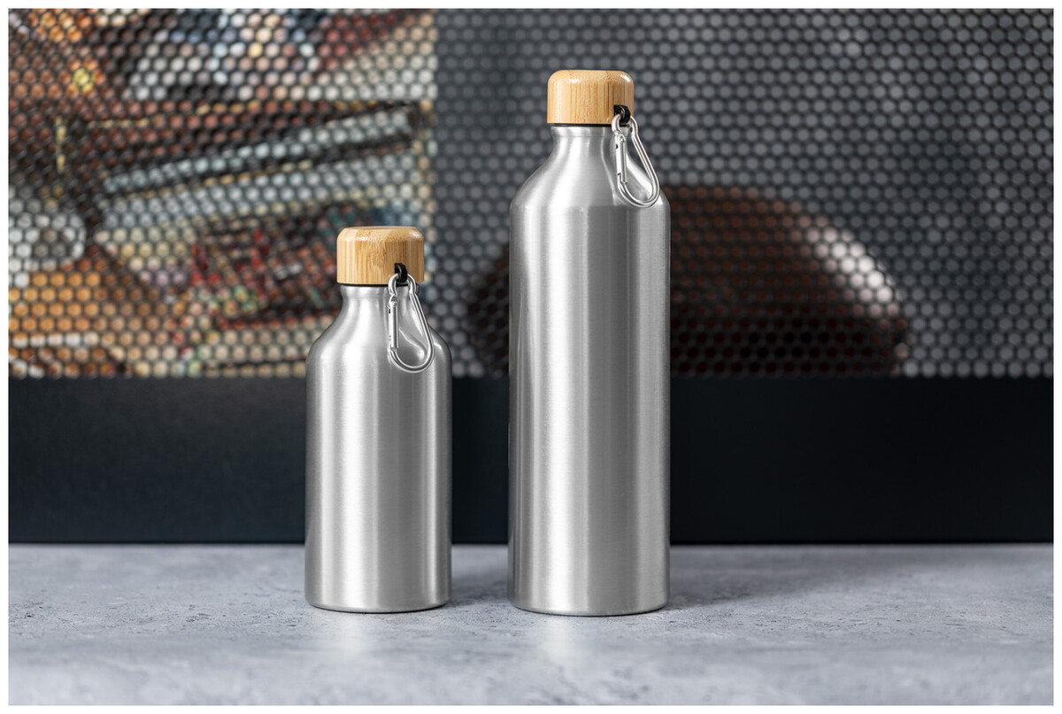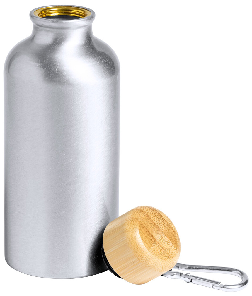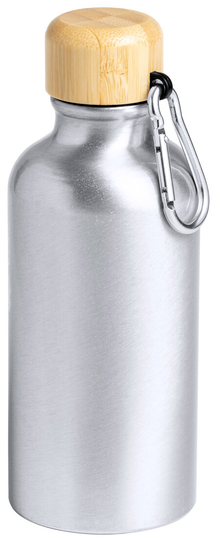 Hliníková sportovní láhev s bambusovým víčkem a karabinou, 400 ml. Není vhodná pro sycené nápoje.