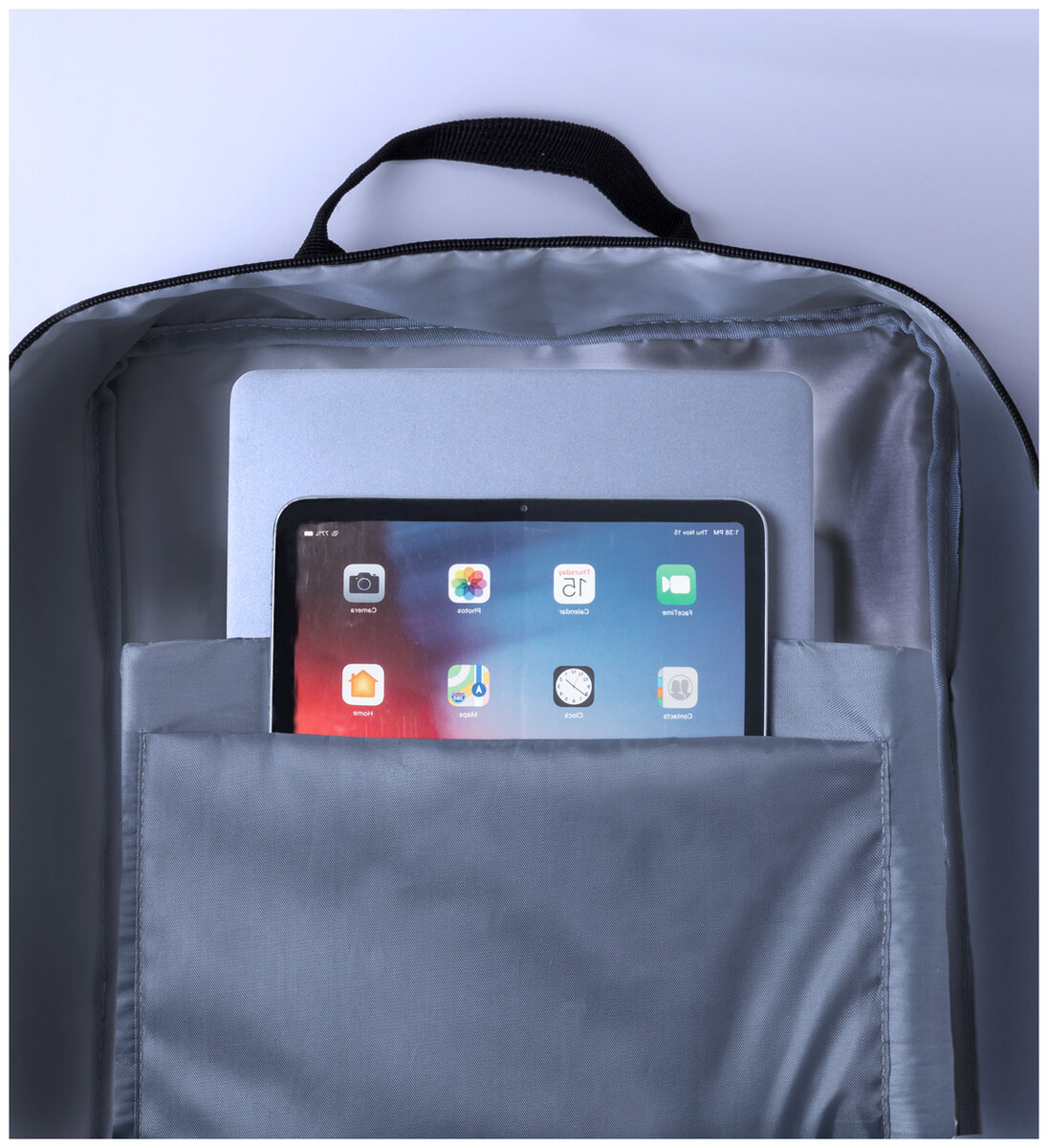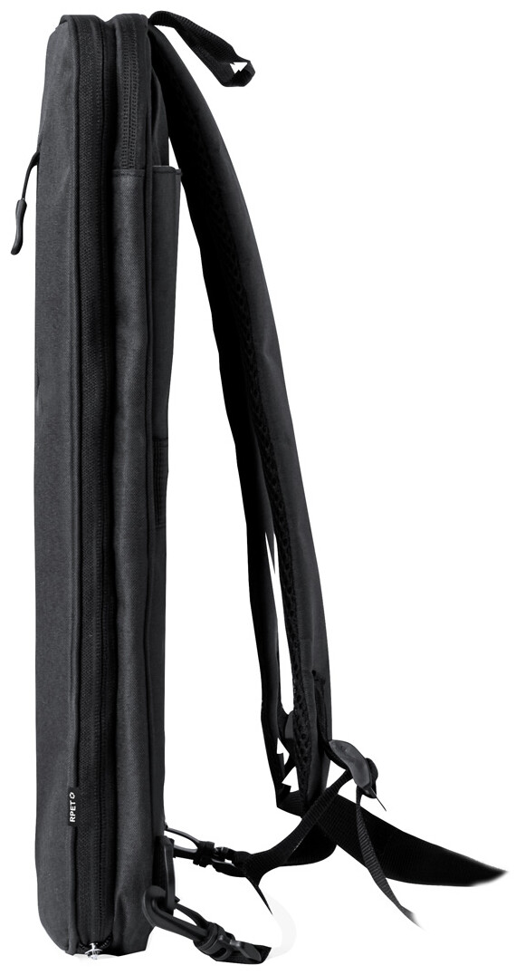 Rozšiřitelný RPET batoh s přihrádkami na zip, polstrovanou přihrádkou na notebook (15") a tablet (10"), polstrovaná záda a ramenní popruhy. 300D RPET polyester s výrazným štítkem RPET.
