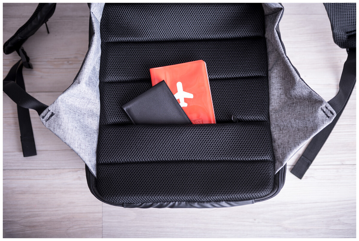 Voděodolný batoh, s ochranou proti krádeži s mnoha přihrádkami na zip, vypolstrovaná přihrádka na laptop (15") a tablet (10"), vypolstrované zadní a ramenní popruhy. S vestavěným připojením USB pro power banky. 1200D Nylon.