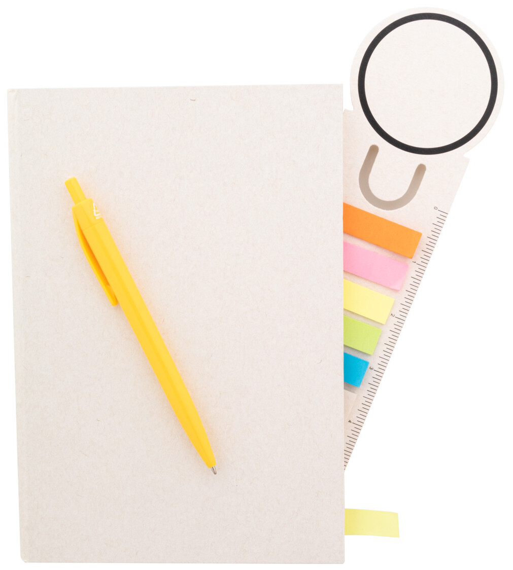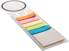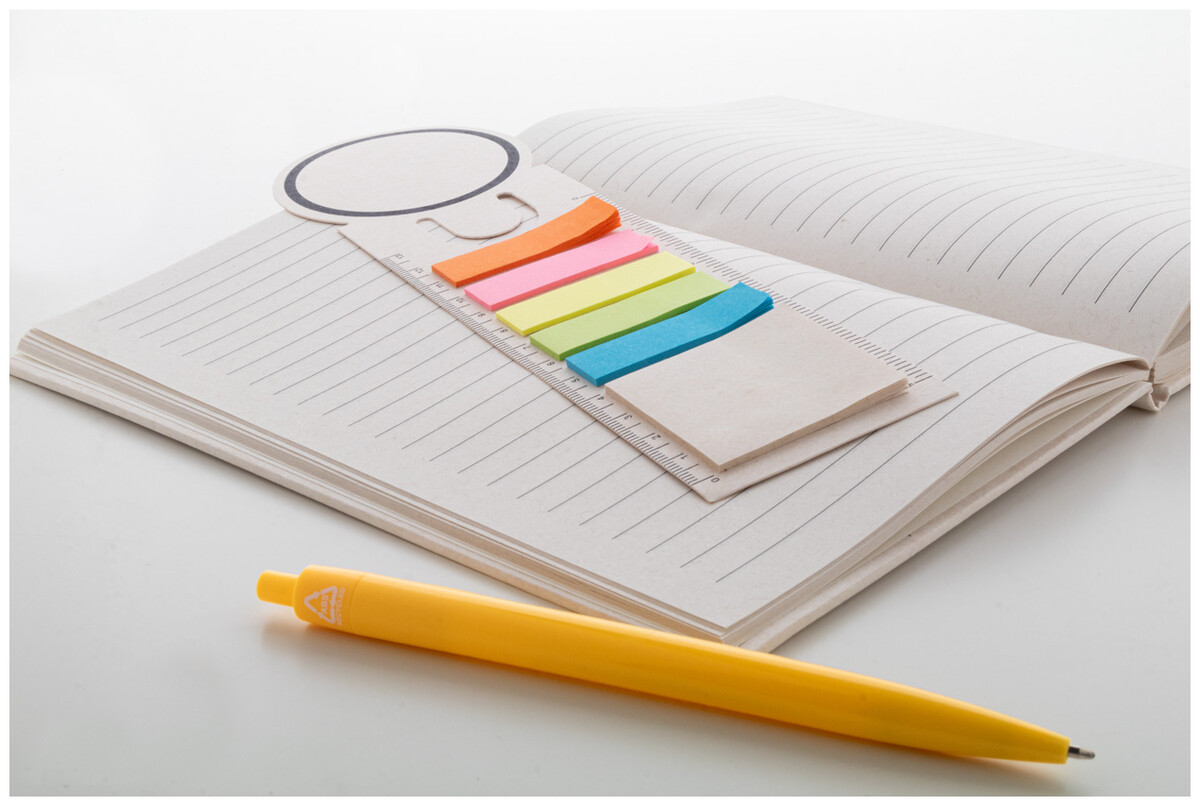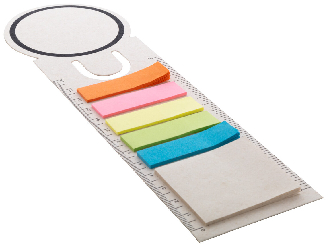 Záložka a pravítko z recyklovaného kartonu na mléko s 15 lepicími papírky a 75 značkovači stránek (v 5 různých barvách).