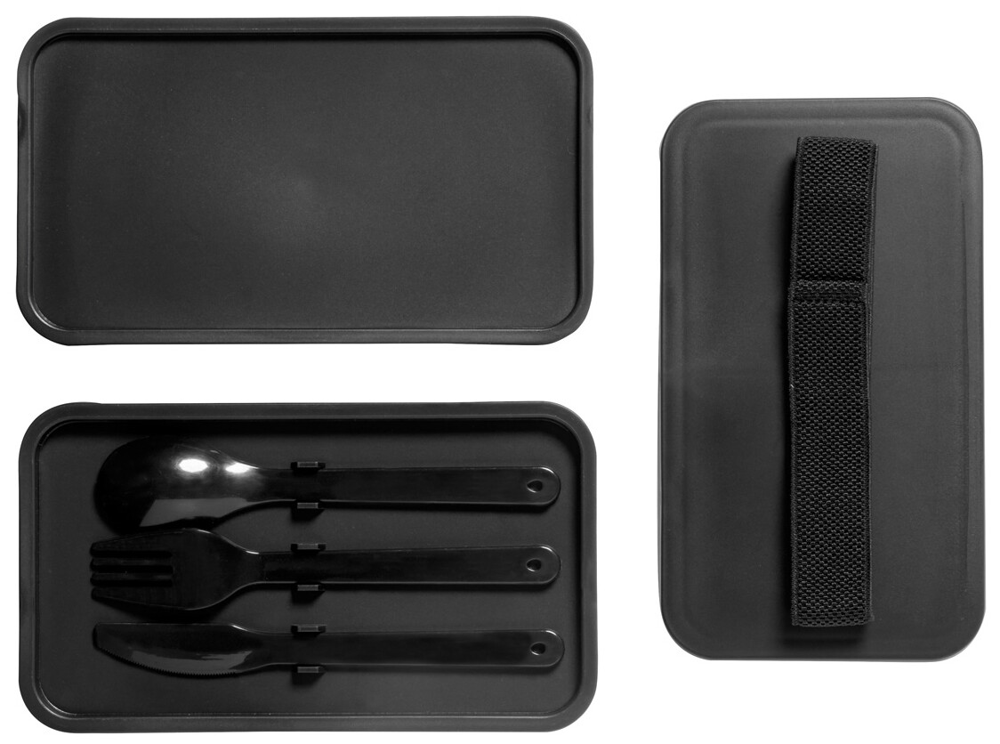 Box na jídlo z PP plastu se sadou příborů (vidlička, lžíce a nůž) a elastickým páskem. Se 2 přihrádkami o objemu 700 ml.