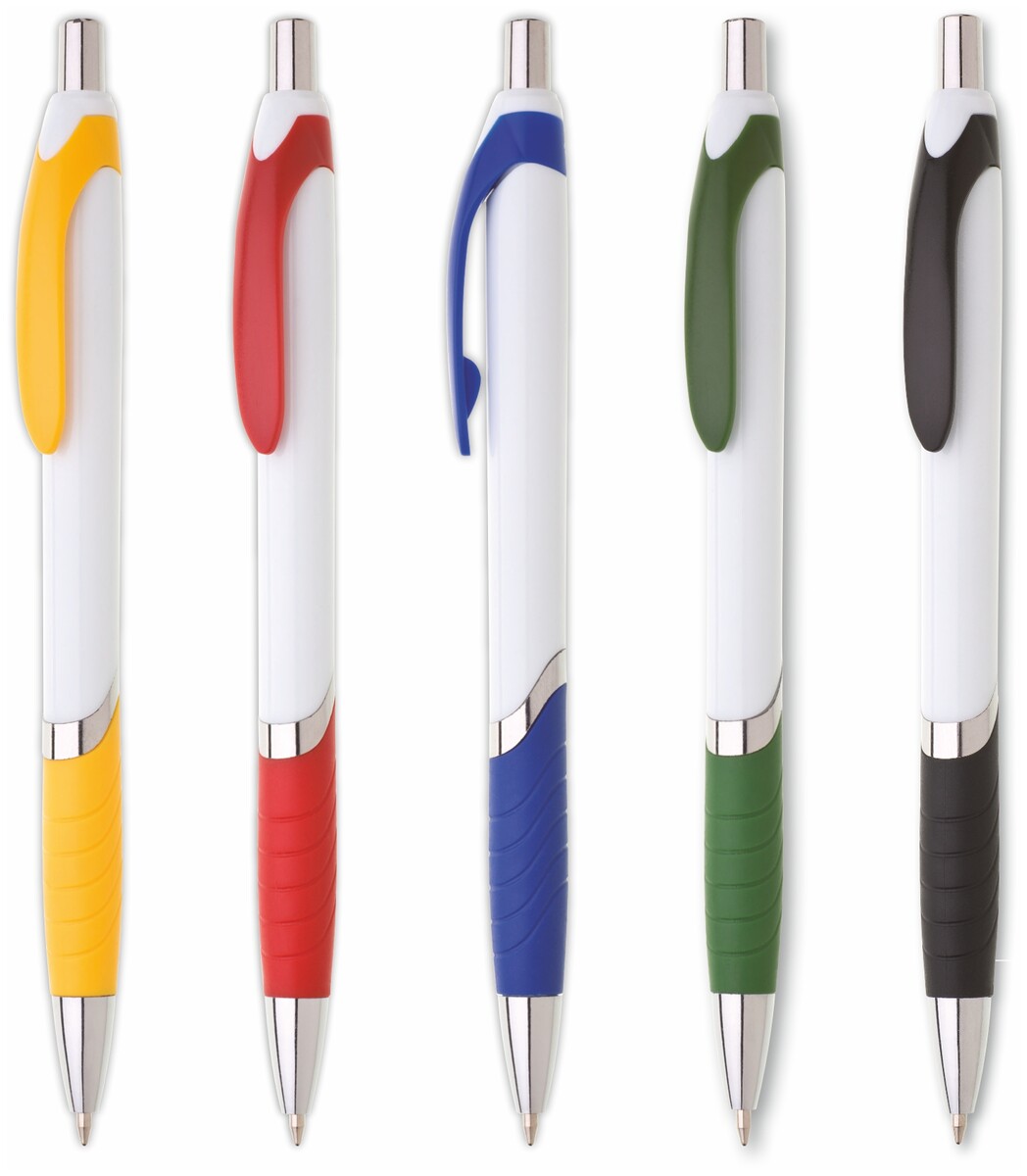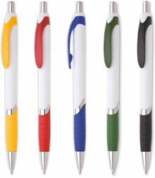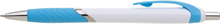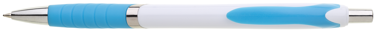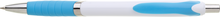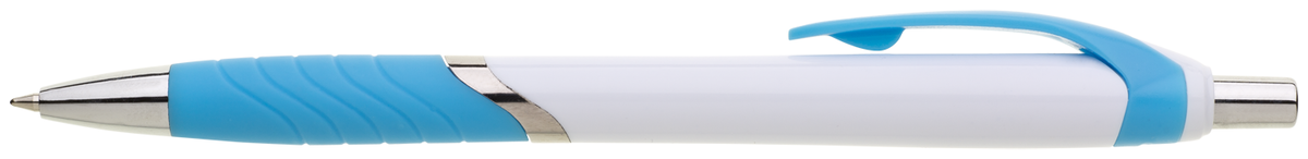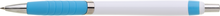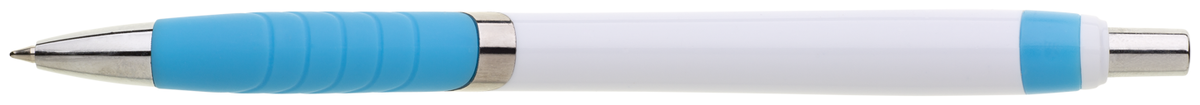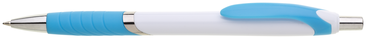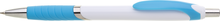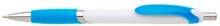 Plastová propiska s bílým tělem tyrkysovým úchopem a klipem a stříbrnými doplňky.