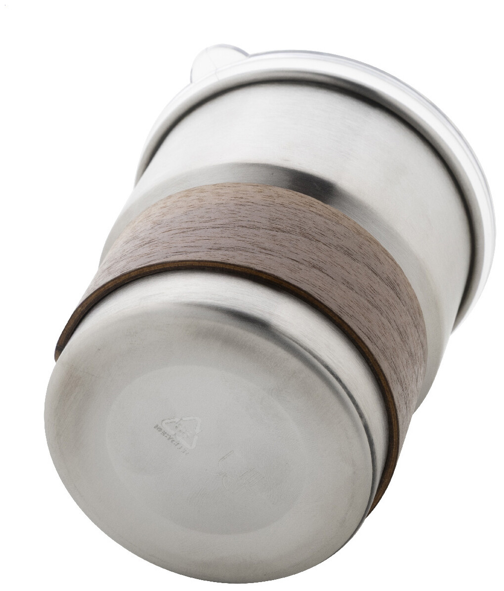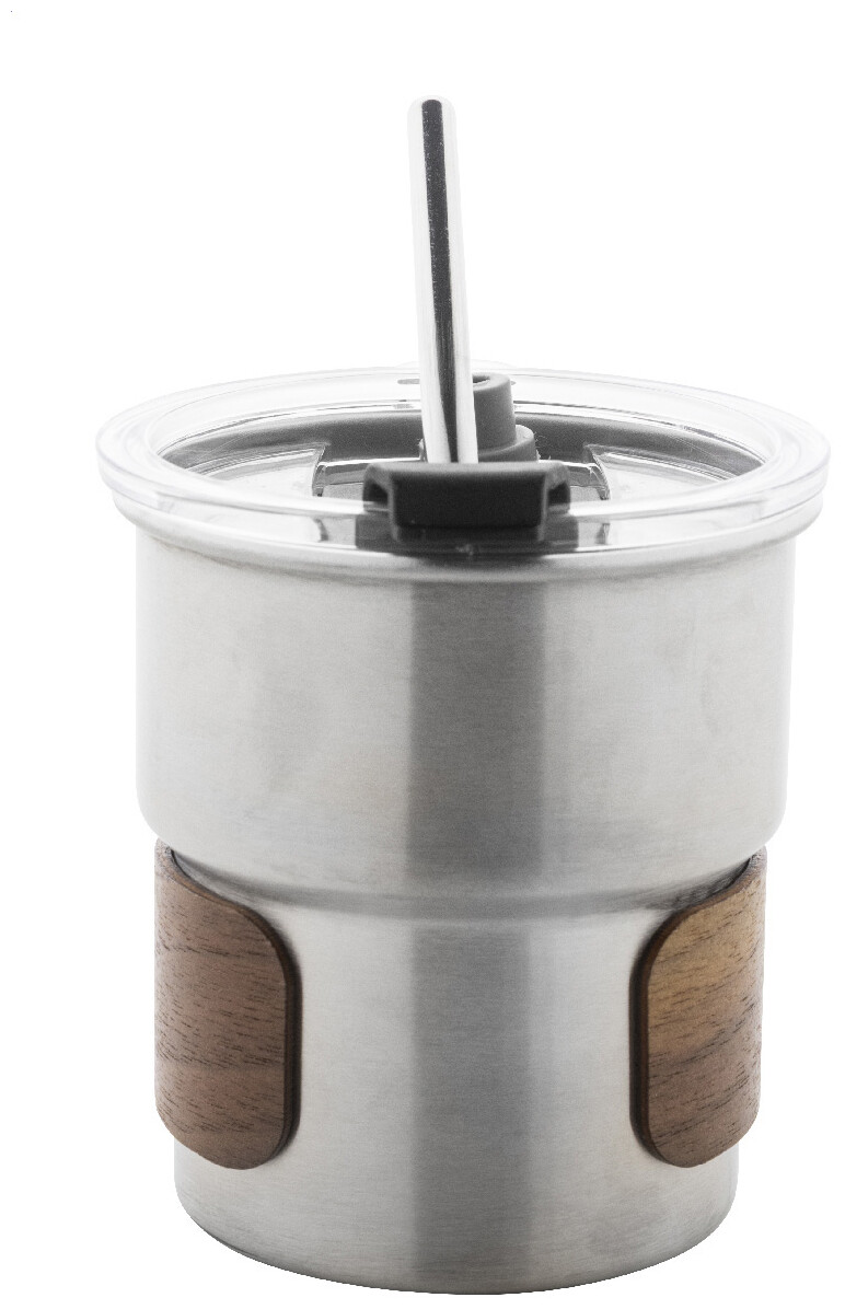 Jednostěnný cestovní hrnek z recyklované nerezové oceli s úchopem z ořechového dřeva, plastovým víčkem a brčkem z recyklované nerezové oceli. 260 ml.