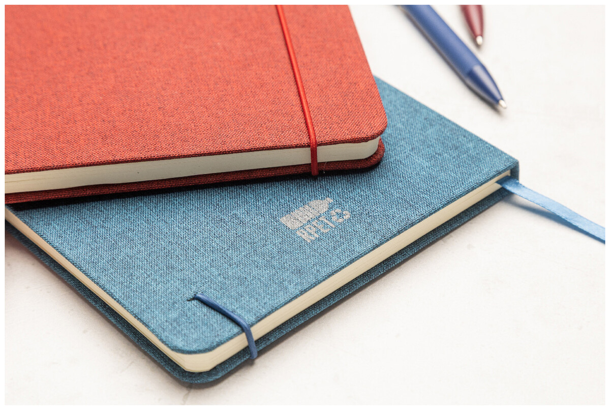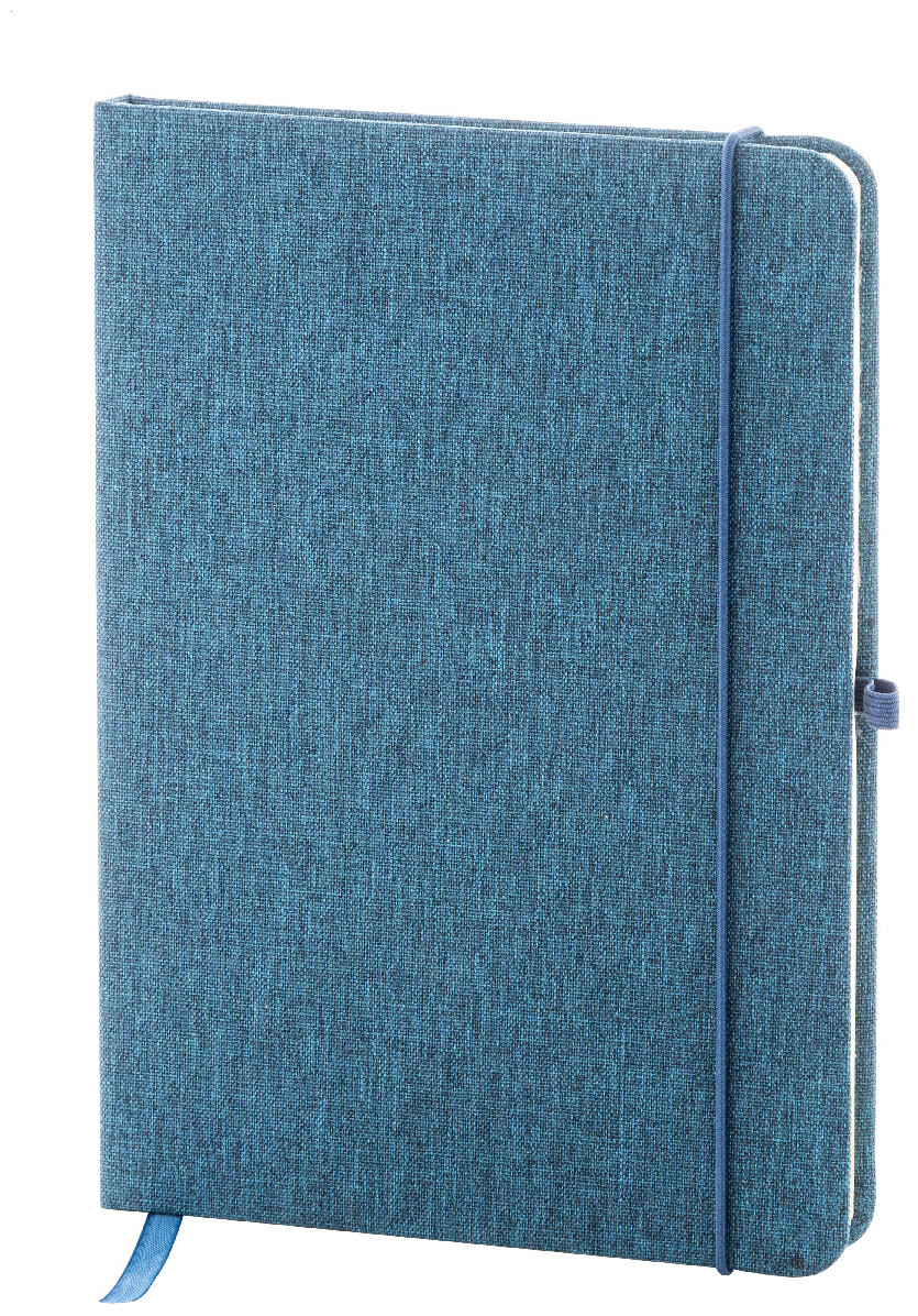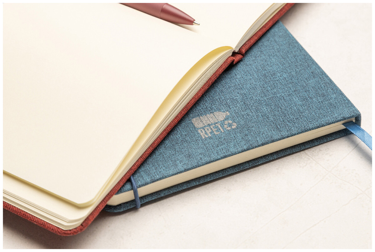 Blok A5 potažený polyesterem 300D RPET s 80 čistými listy. S gumovým páskem, záložkou a držákem na pero.
