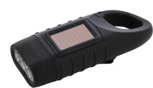 Baterka z recyklovaného ABS plastu se 3 LED diodami, vestavěnými solárními a dynamovými nabíječkami a karabinou.