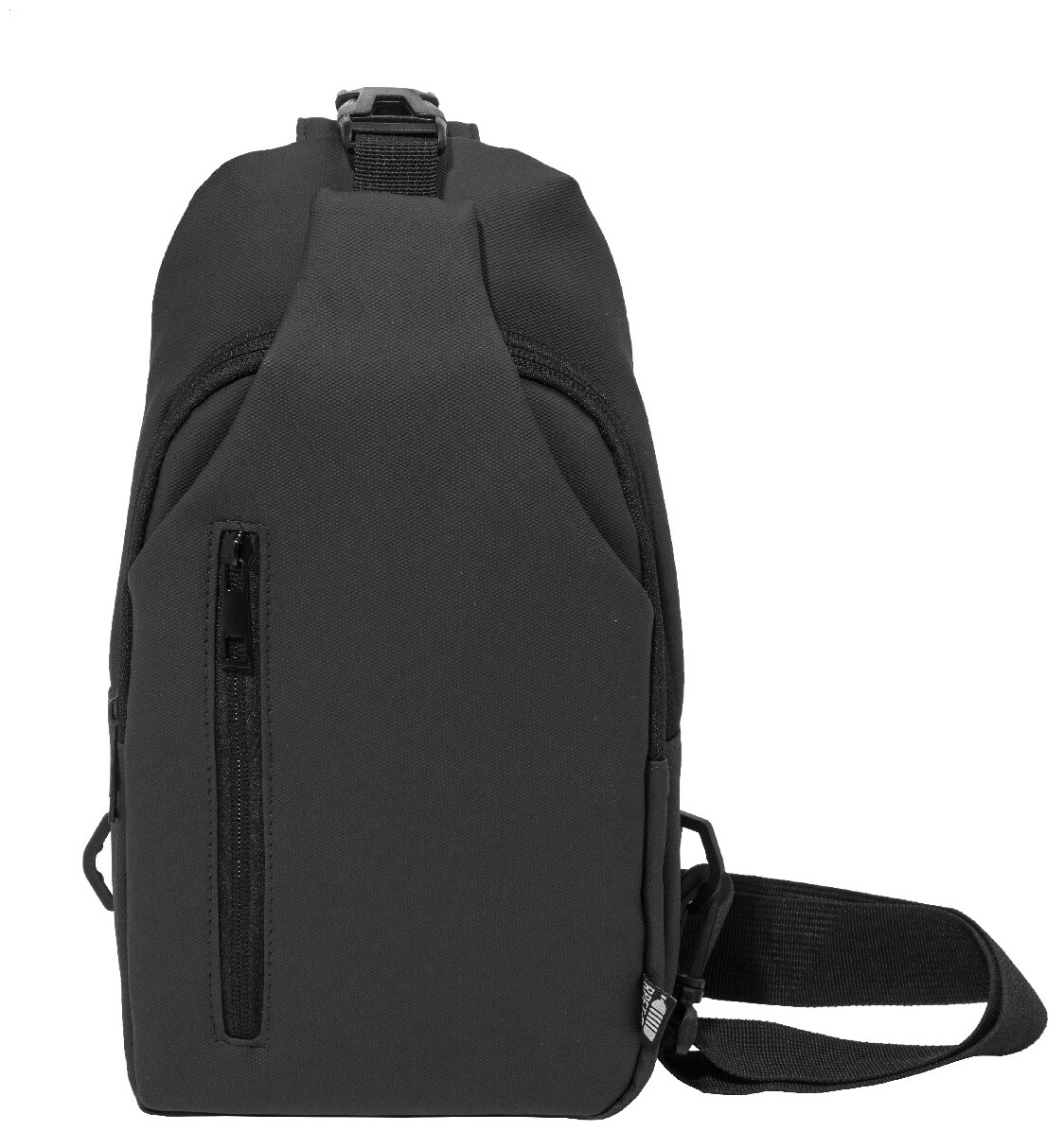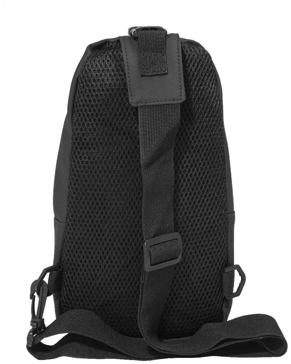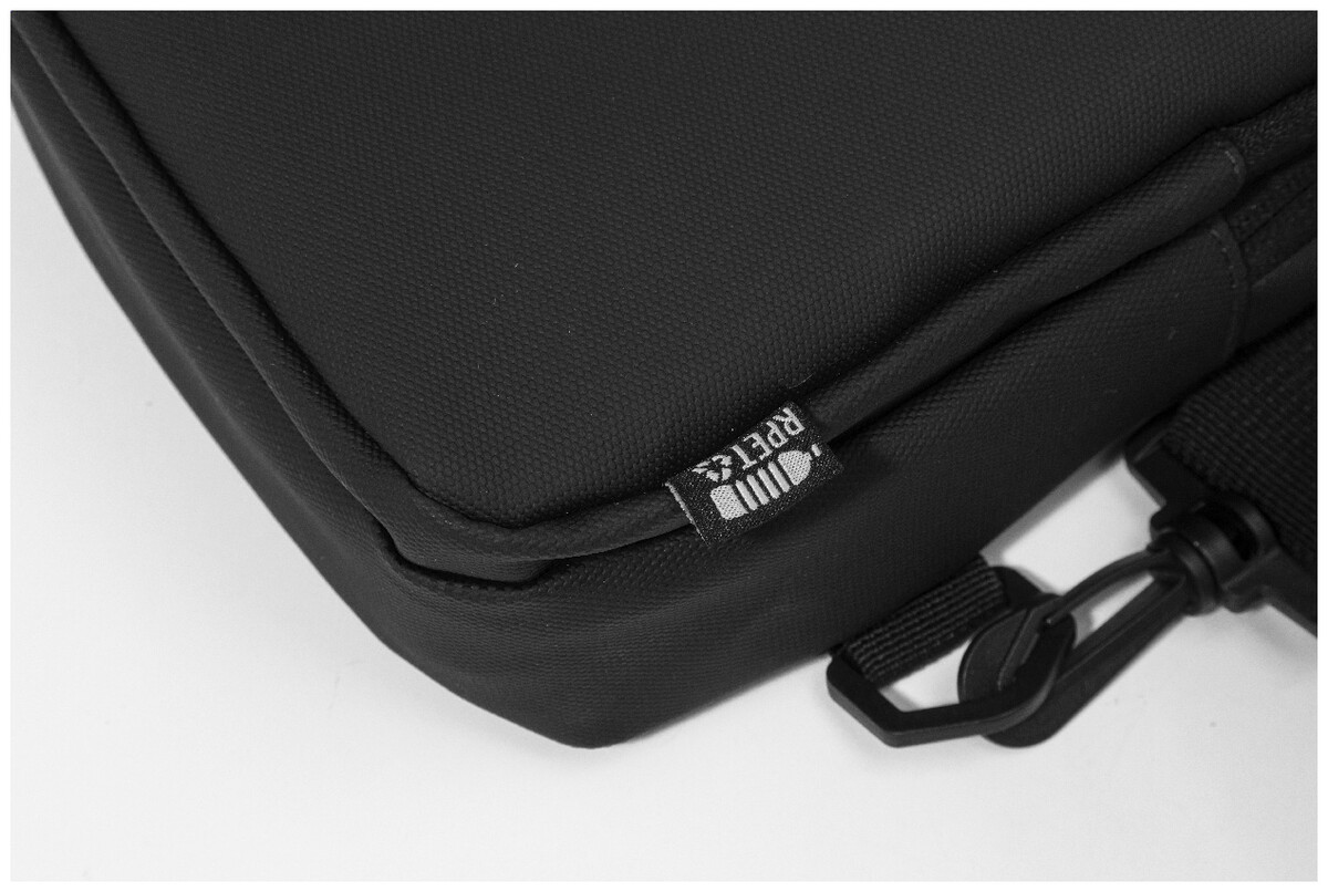 Voděodolná RPET crossbody taška na zavěšení přes rameno s kapsami na zip, zapínáním na přezku a polstrovanými zády. S nastavitelným ramenním popruhem vybaveným polohami na levé a pravé straně. Polyester RPET 600D potažený PU, s výraznou etiketou RPET.