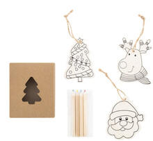 Sada vánočních ozdob na vybarvení v krabičce z kraftového papíru s vyřezávaným vánočním stromečkem. Včetně 3 dřevěných ozdob s konopnou šňůrou a 4 barevných tužek.