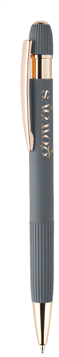 Kuličkové pero z recyklovaného hliníku s pogumovaným tělem a detaily v růžovo-zlaté barvě. Se speciálním povlakem pro zrcadlové laserové gravírování v růžovo-zlaté barvě. S modrou náplní.