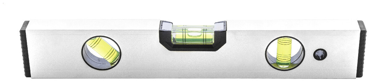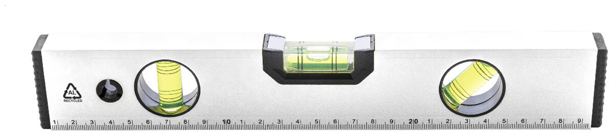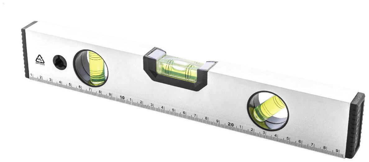 Magnetická vodováha z recyklovaného hliníku se třemi vodováhami (horizontální, vertikální a 45°) a 30cm pravítkem.