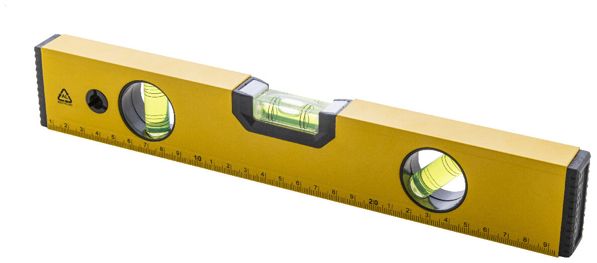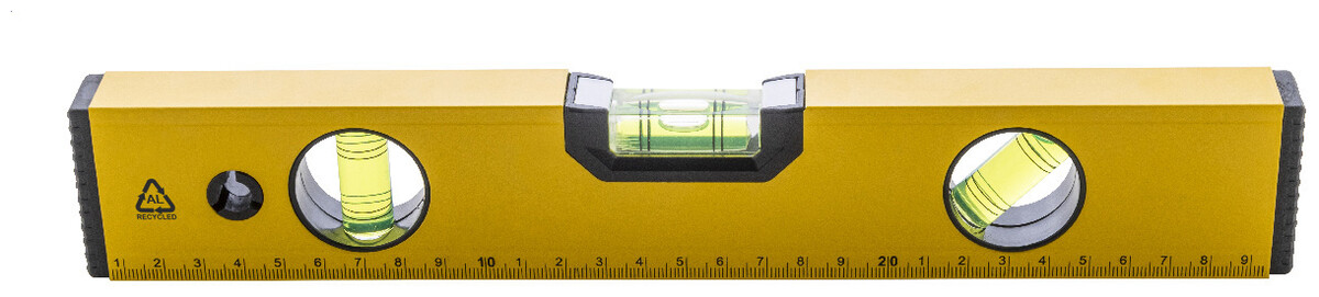 Magnetická vodováha z recyklovaného hliníku se třemi vodováhami (horizontální, vertikální a 45°) a 30cm pravítkem.
