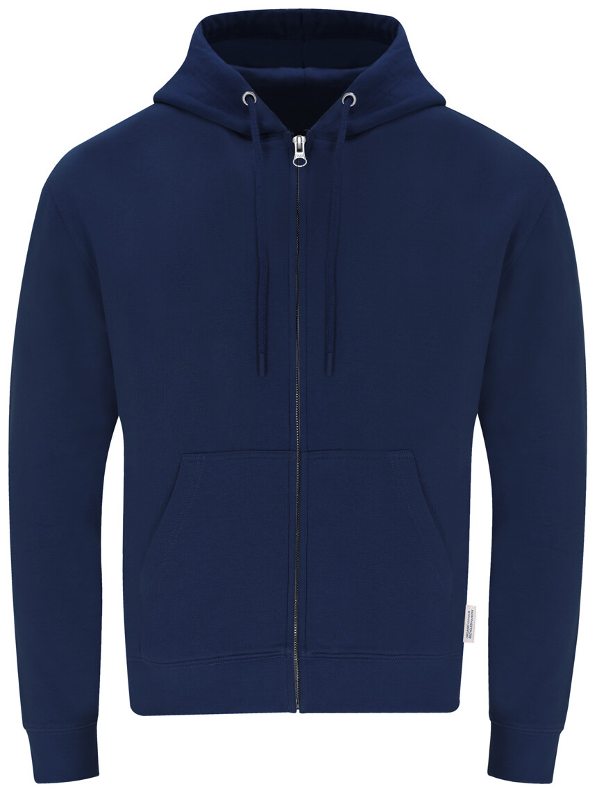 Mikina s kapucí na zip a předními kapsami ze 60% organické bavlny a 40% RPET polyesteru, 280 g/m2.