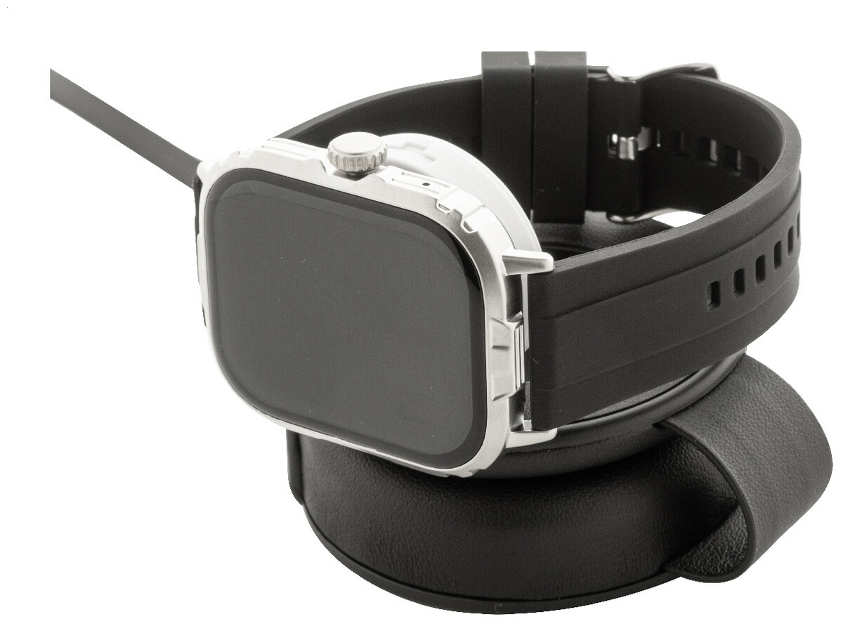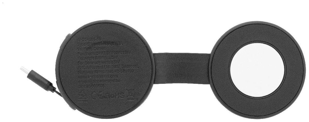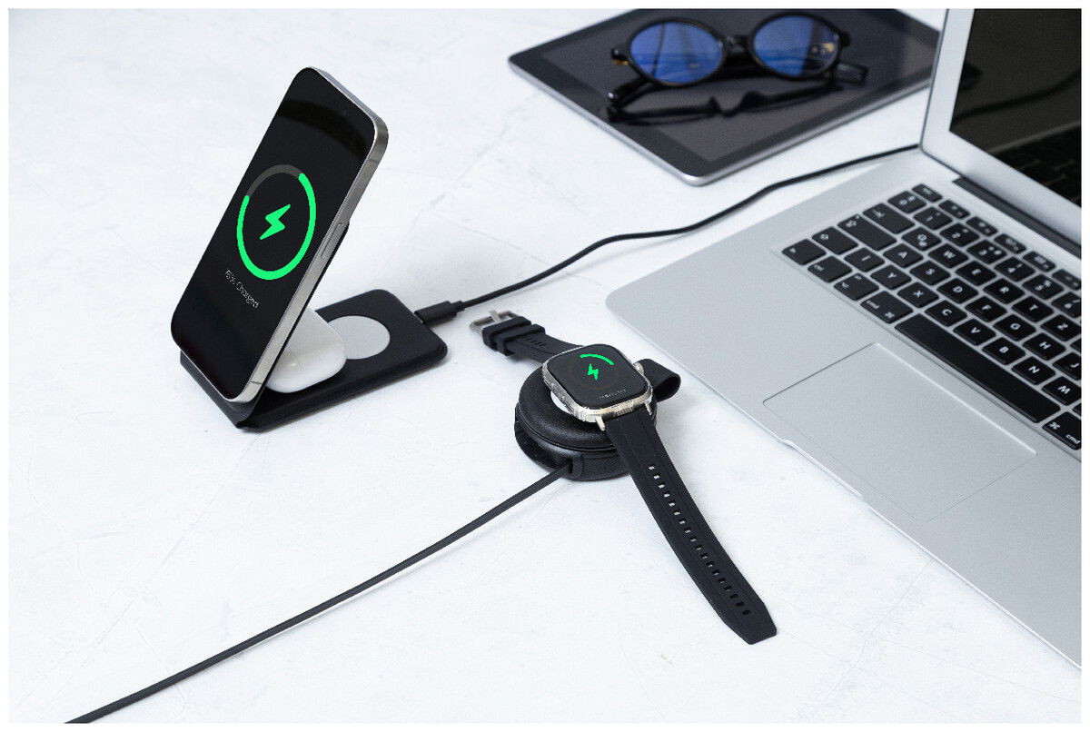 Luxusní skládací bezdrátová nabíjecí sada z recyklované PU kůže s magnetickou bezdrátovou rychlonabíječkou (15 W), sekundární bezdrátovou nabíječkou (2,5 W) pro chytré hodinky (Apple® a Samsung®) a vestavěným teleskopickým nabíjecím kabelem USB-C. Včetně samolepicího kovového kroužku pro použití magnetické funkce na jakémkoli bezdrátově nabíjecím zařízení. Kompatibilní s iPhone® 12 nebo novějším.