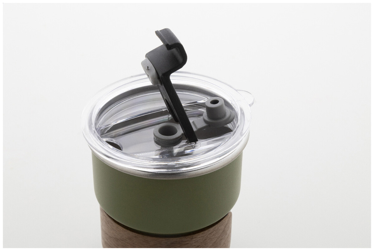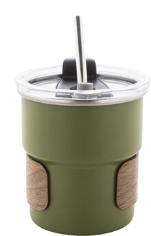 Jednostěnný cestovní hrnek z recyklované nerezové oceli s úchopem z ořechového dřeva, plastovým víčkem a brčkem z recyklované nerezové oceli. 260 ml.