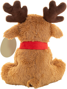 RPET plyšový vánoční sob se šálou. S tisknutelnou visačkou z kraftového papíru na uchu.