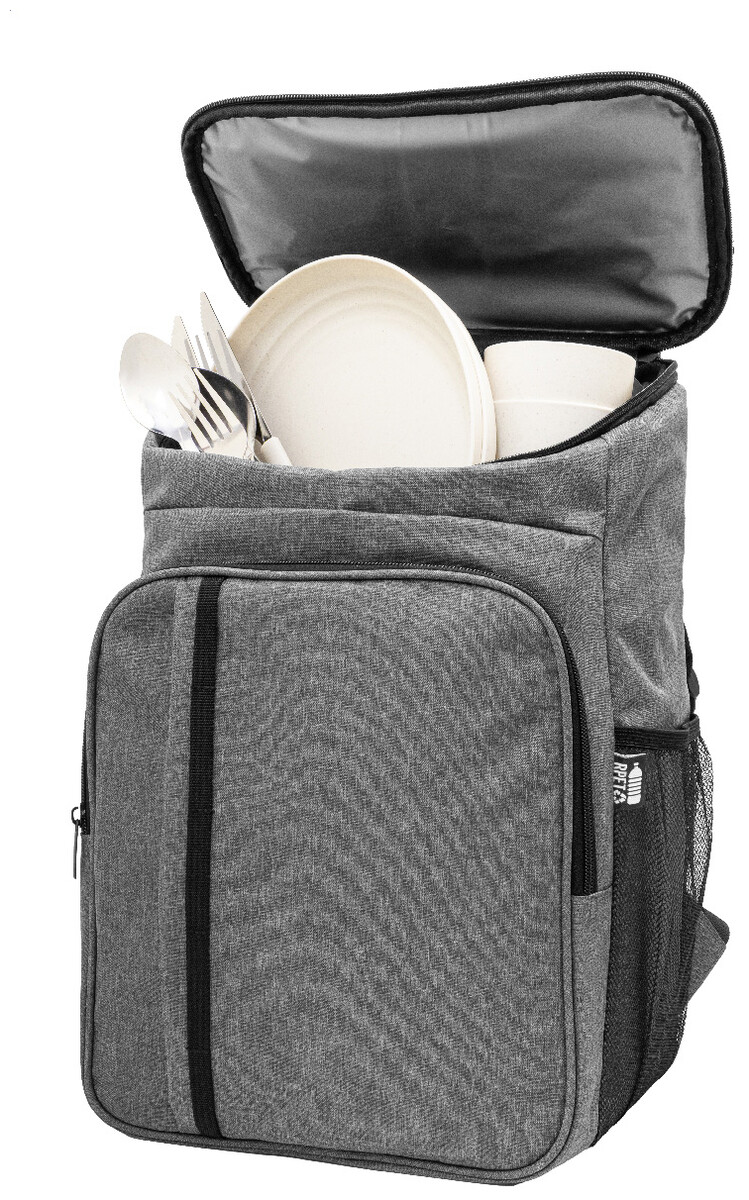 Chladicí piknikový batoh z RPET s přední kapsou na zip a chladicí přihrádkou na zip s PEVA výplní. S bočními síťovanými kapsami, polstrovanými zády a ramenními popruhy. Včetně nádobí z PP a nerezové oceli pro 2 osoby: 2 talíře, 2 hrnky, 2 vidličky, 2 lžíce a 2 nože. 600D RPET polyester s výrazným štítkem RPET.