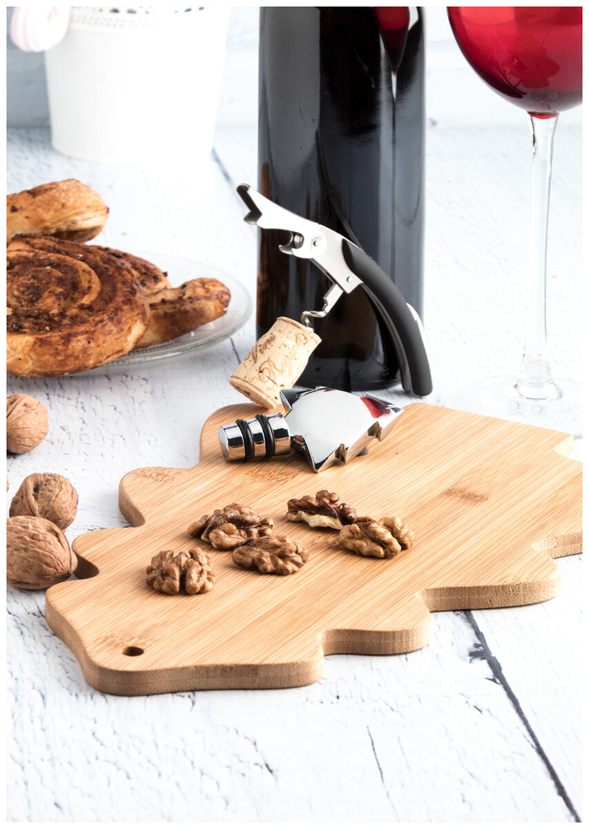 Sada na víno s vývrtkou a zátkou ve tvaru vánočního stromečku, v černé dárkové krabičce.