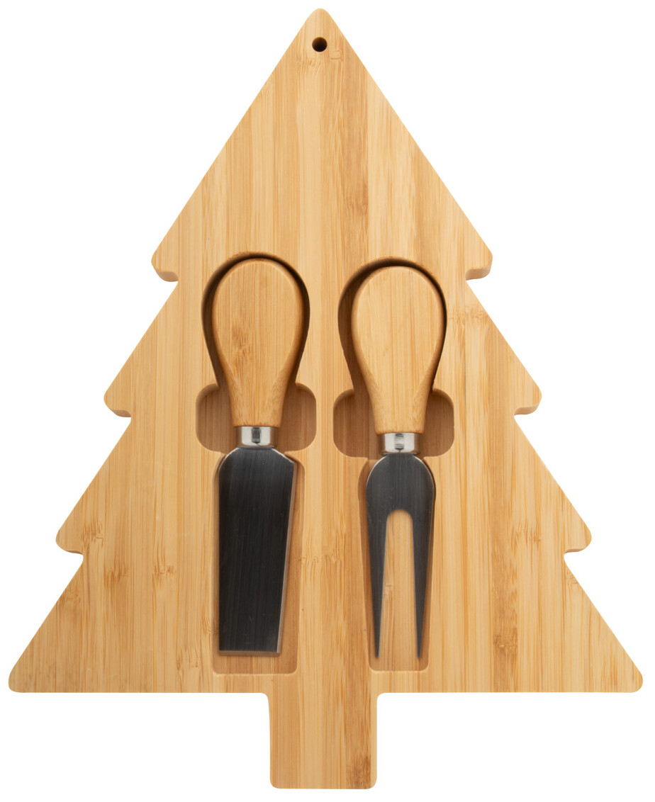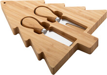 Sada bambusových nožů na sýr ve vánočním designu s prkénkem ve tvaru vánočního stromku a 2 nerezovými noži na sýr. V kraftové papírové krabici.