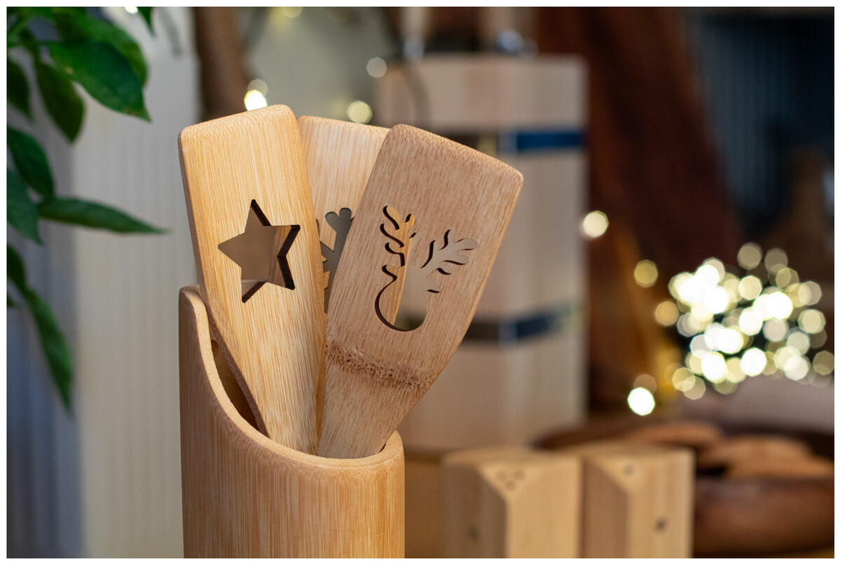 Vařečka z bambusu s vyřezaným vánočním stromečkem.