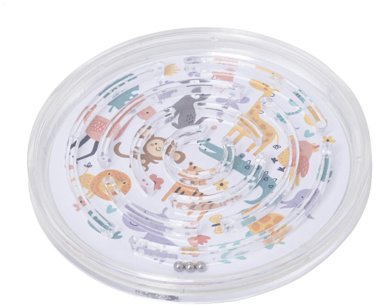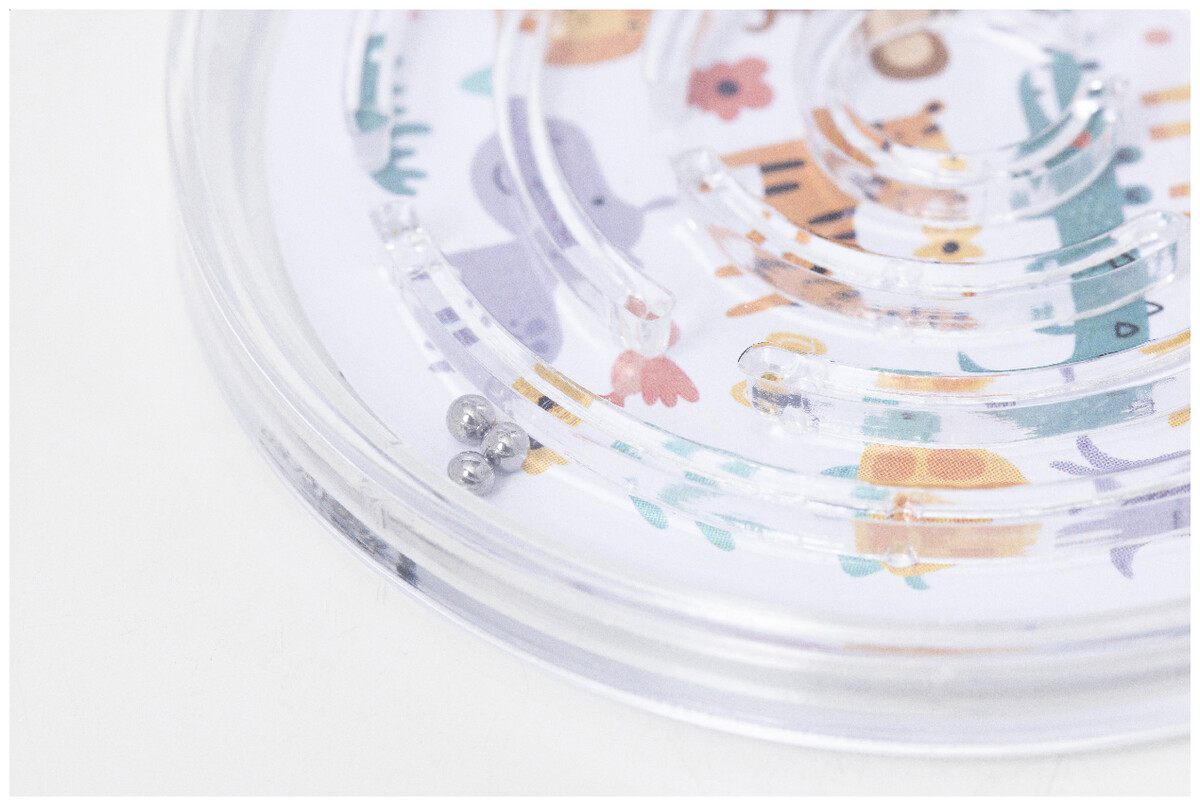 Kulatý labyrint z recyklovaného PS se třemi kovovými kuličkami. S barevnou papírovou vložkou na míru. Cena zahrnuje digitální tisk na obou stranách, nezahrnuje tiskovou přípravu. Min. mn.: 100 ks.