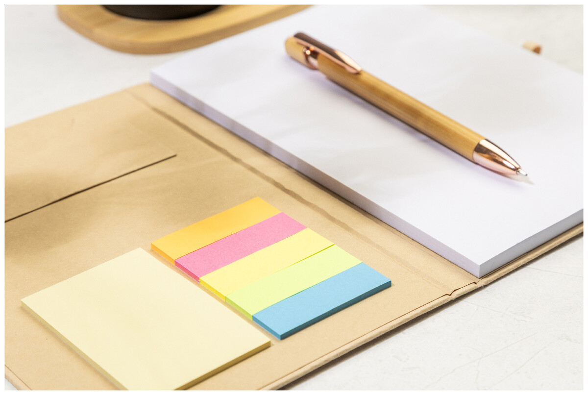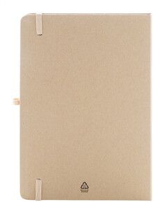 Blok A5 z recyklovaného kartonu s 70 prázdnými listy z recyklovaného papíru. Vnitřní obal obsahuje 25 samolepících papírků, 125 značkovačů stránek a kapsu na vizitky. S gumovým popruhem a držákem na pero.
