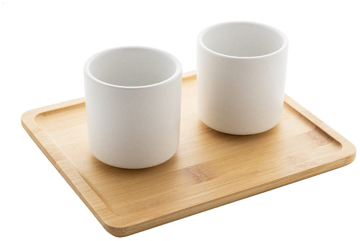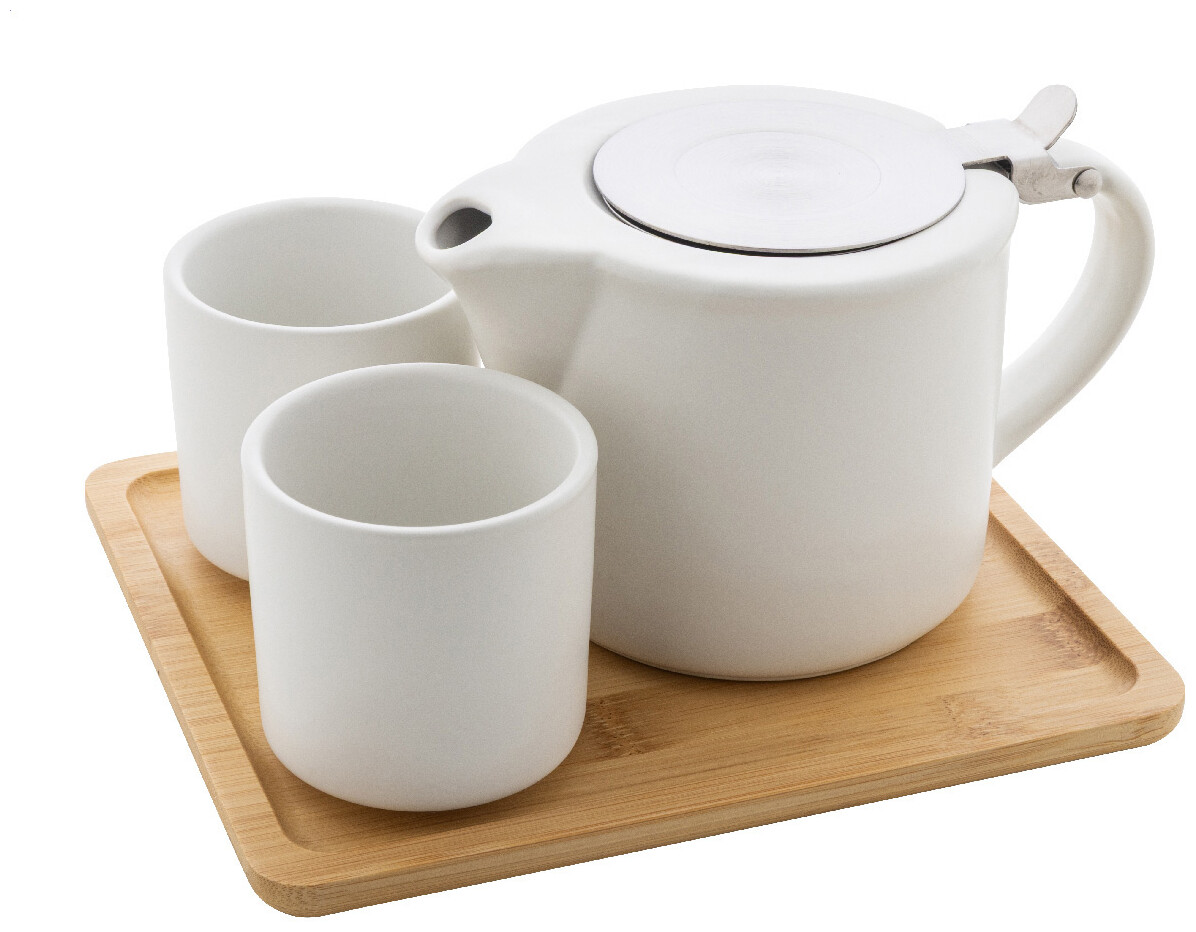 Vysoce kvalitní keramická čajová sada s matným povrchem a bambusovým servírovacím podnosem. Včetně konvice na čaj (500 ml) s víkem z nerezové oceli a sítkem na čaj a dvou šálků (150 ml). V krabičce z kraftového papíru.