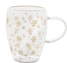 Dvoustěnný termohrnek z borosilikátového skla s motivem vánočních sněhových vloček, 350 ml. V krabičce z kraftového papíru.