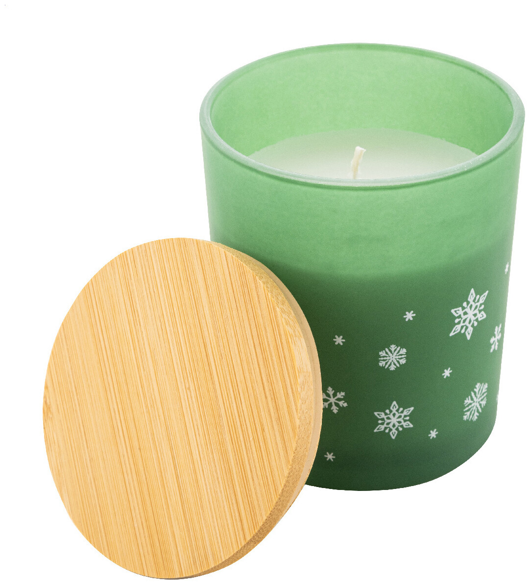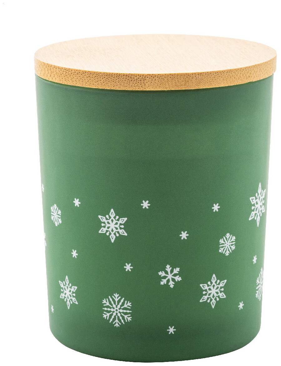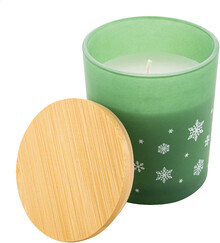 Vonná vosková svíčka na rostlinné bázi v matném skleněném svícnu s vánoční ozdobou ve tvaru sněhové vločky a bambusovým víčkem. Se 120 gramy vosku. V krabičce z kraftového papíru.
