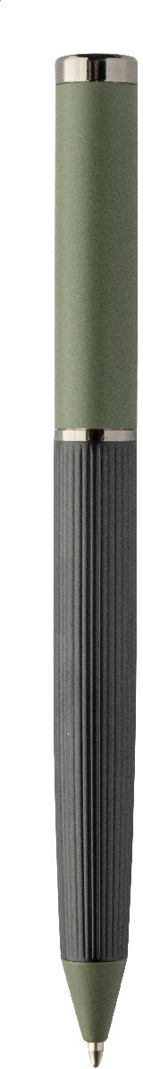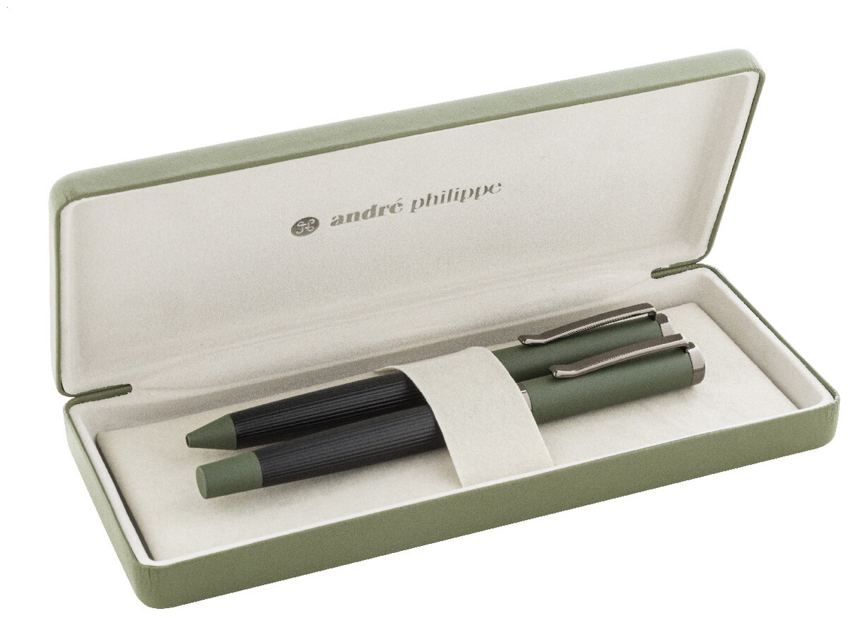 Elegantní sada kovového kuličkového pera a rolleru s pruhovaným tělem, barevnými akcenty a lesklými detaily v barvě antracit. V barevně sladěné dárkové krabičce a s modrou náplní. Produkt značky André Philippe.