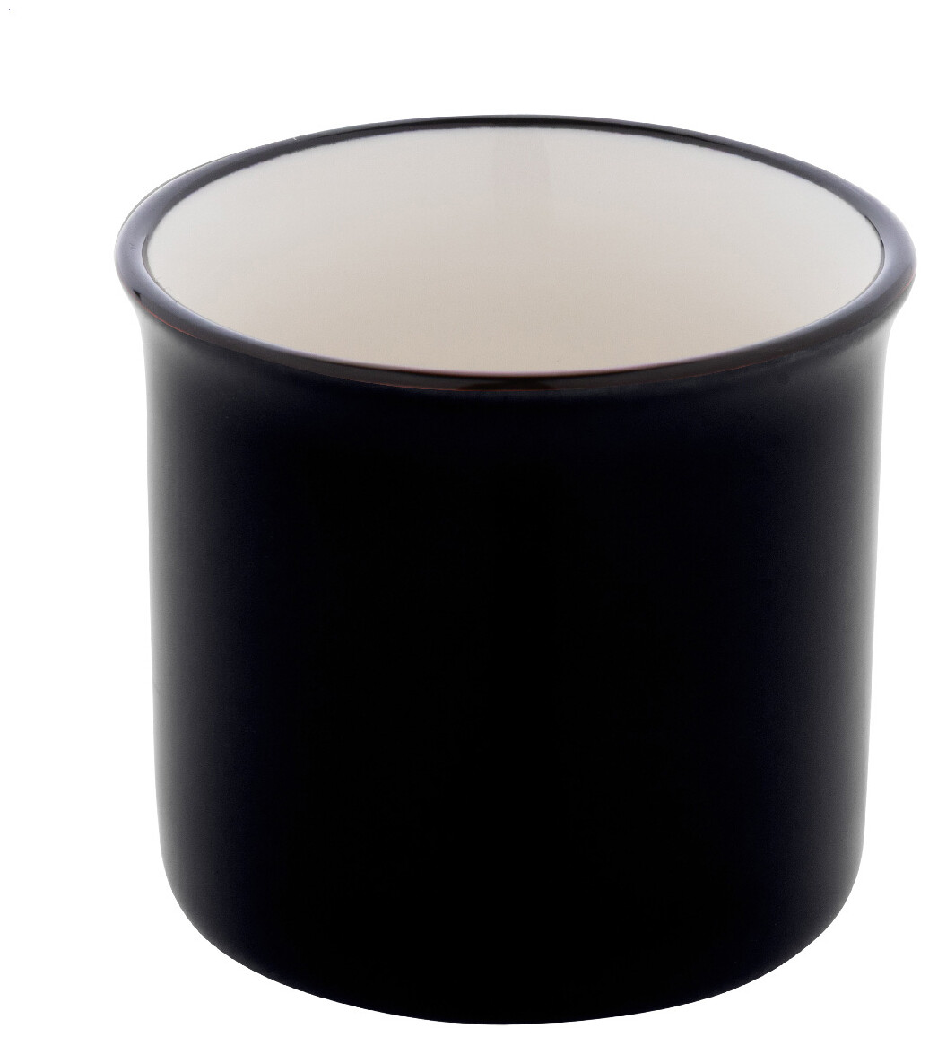 Mini vintage keramický hrnek s černým okrajem, bílým uvnitř a barevným vnějškem, 90 ml. V krabičce z kraftového papíru.