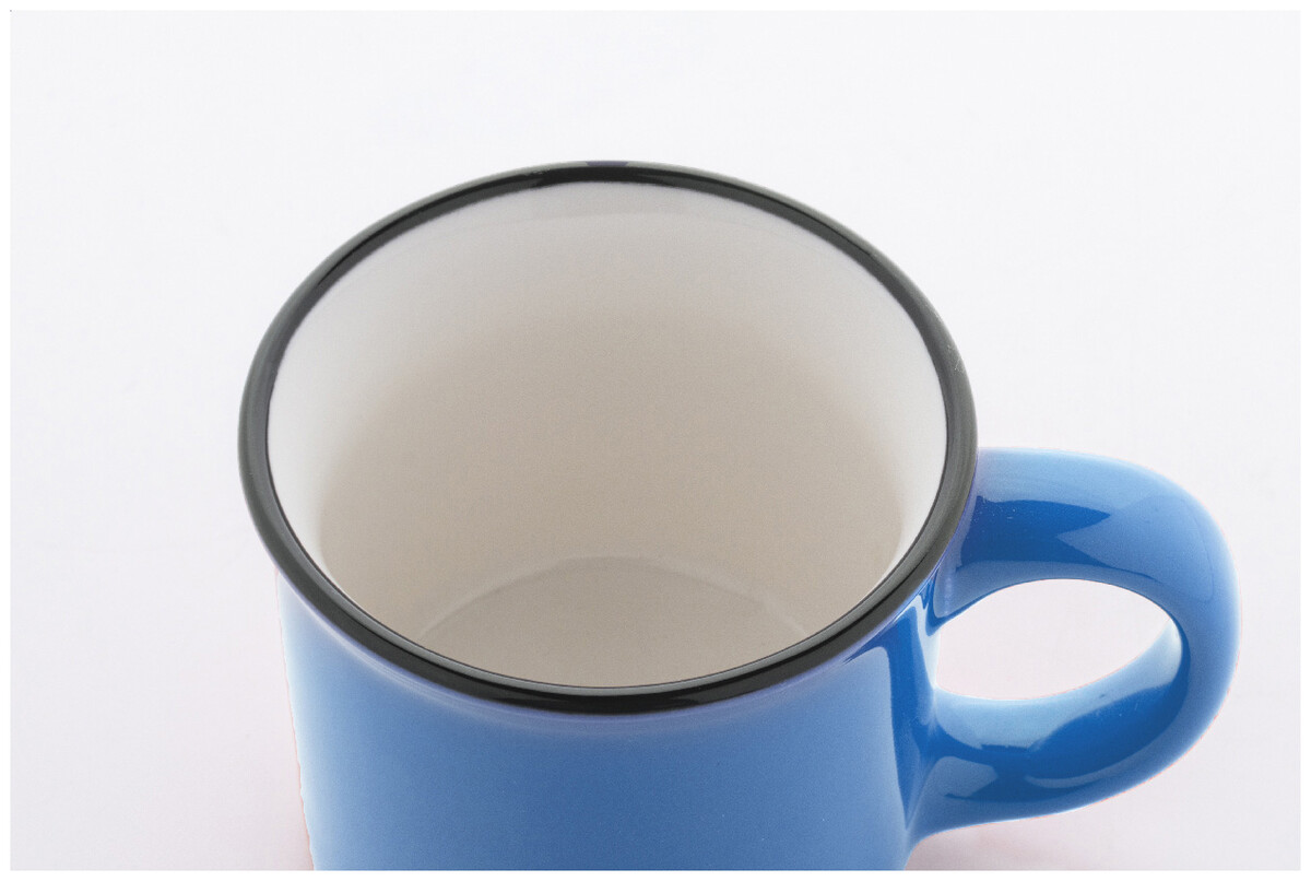 Mini vintage keramický hrnek s černým okrajem, bílým uvnitř a barevným vnějškem, 90 ml. V krabičce z kraftového papíru.