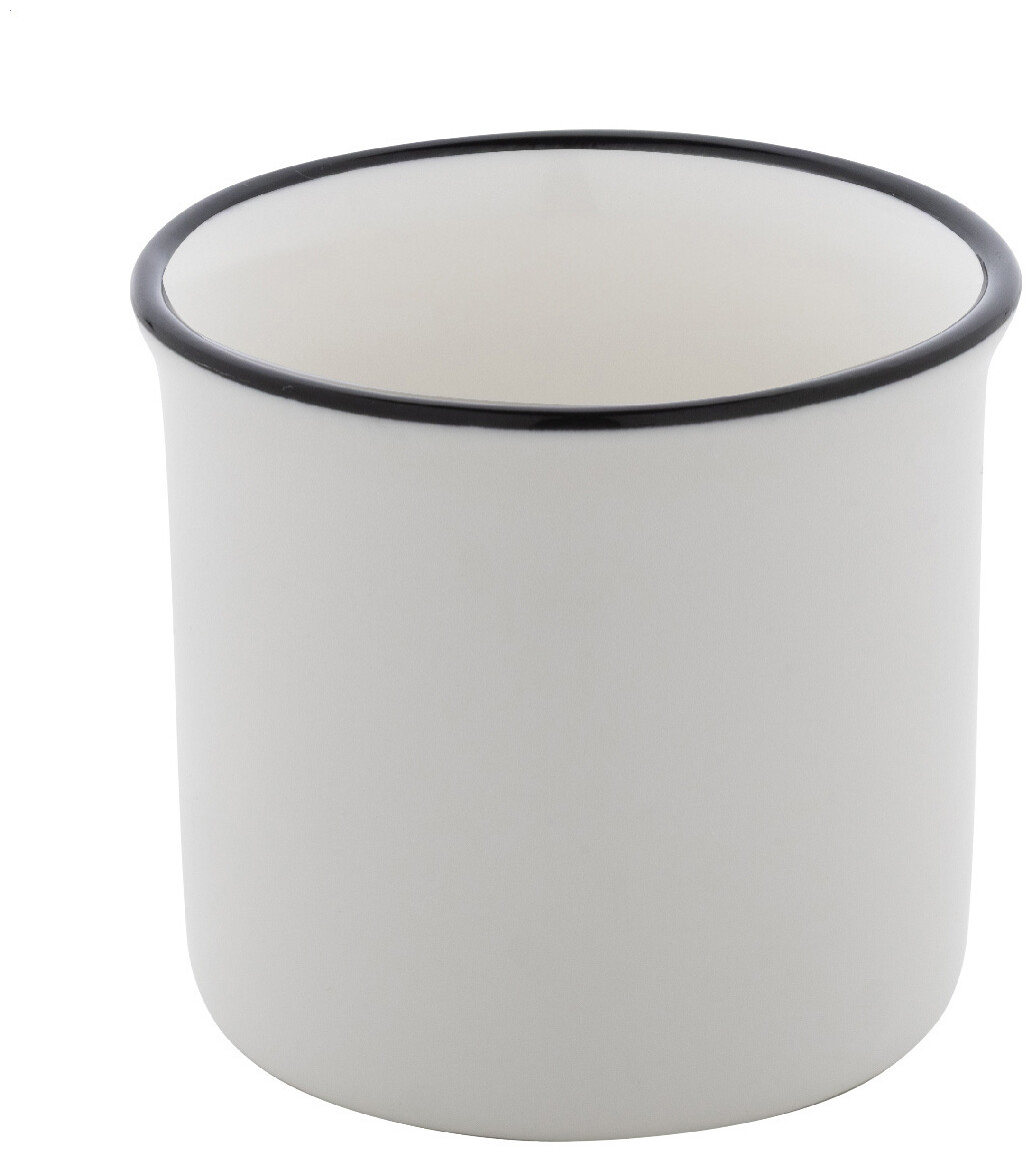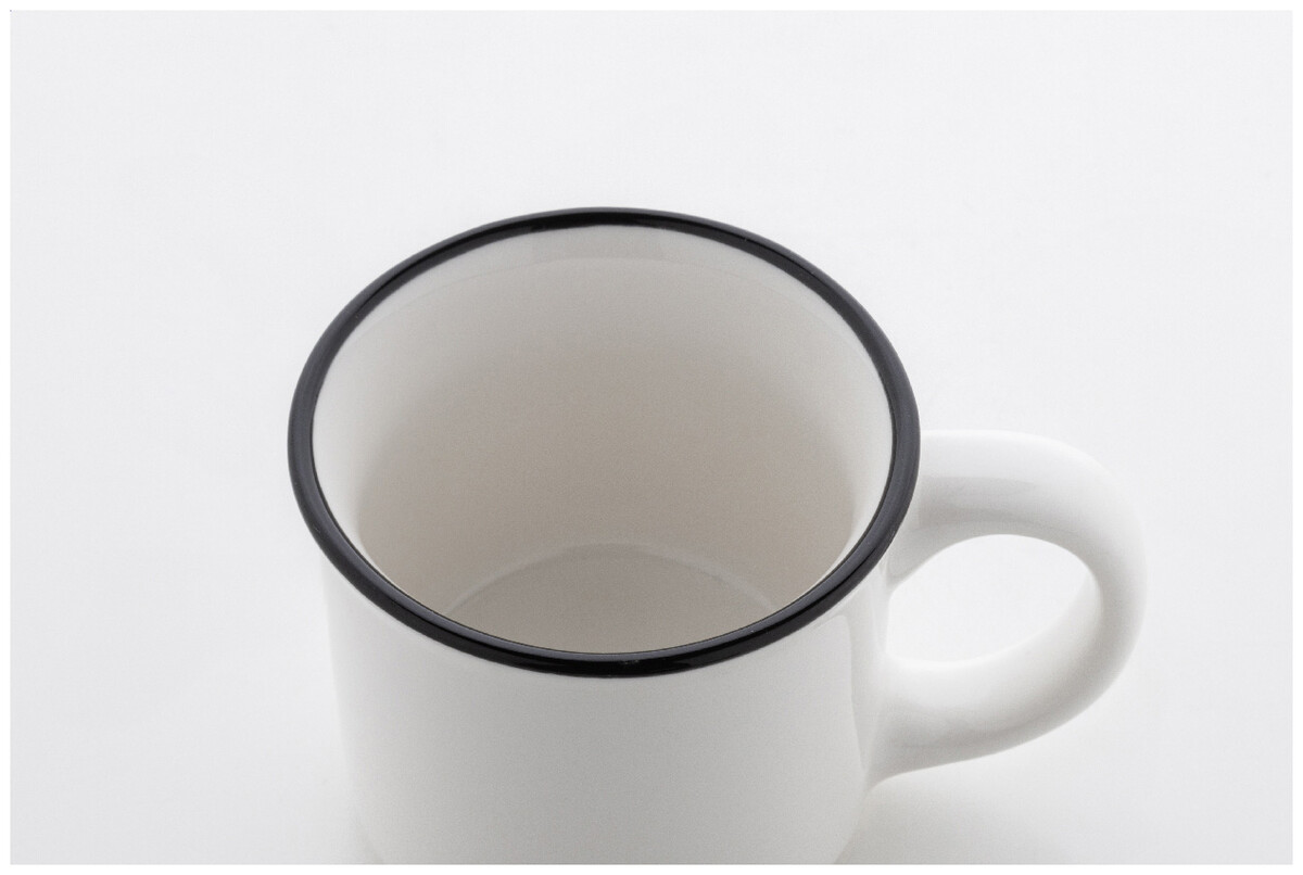 Mini vintage keramický hrnek s černým okrajem, bílým uvnitř a barevným vnějškem, 90 ml. V krabičce z kraftového papíru.