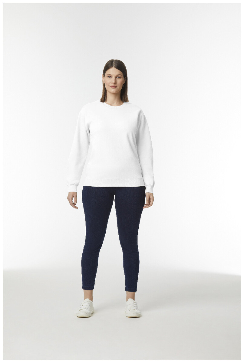 Mikina s kulatým výstřihem, 80% bavlna a 20% polyester. 285 g/m2 (bílá 278 g/m2). Značka Gildan.