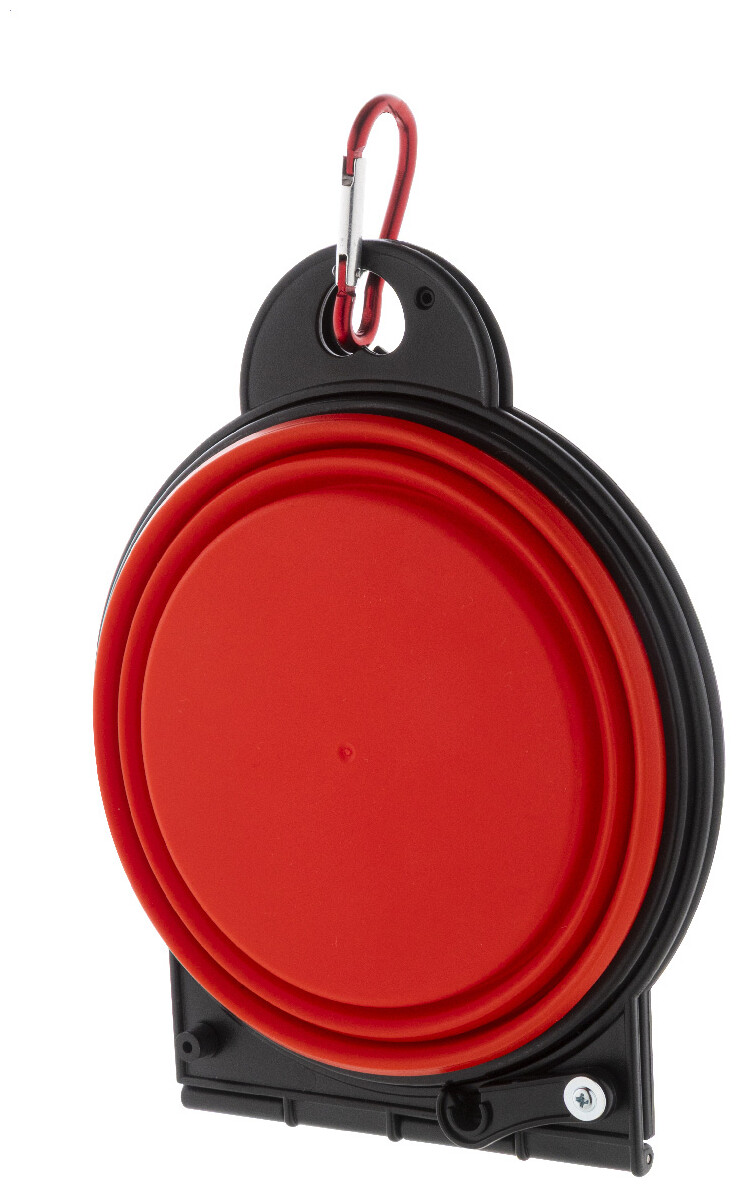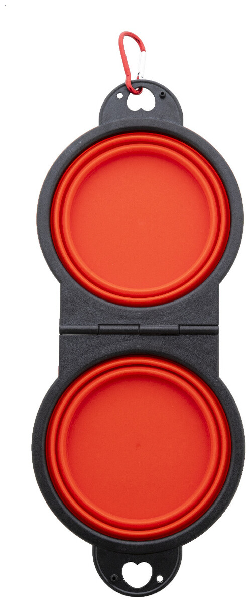 Skládací miska pro domácí mazlíčky z odolného TPE se dvěma přihrádkami o objemu 450 ml a barevně sladěnou hliníkovou karabinou.