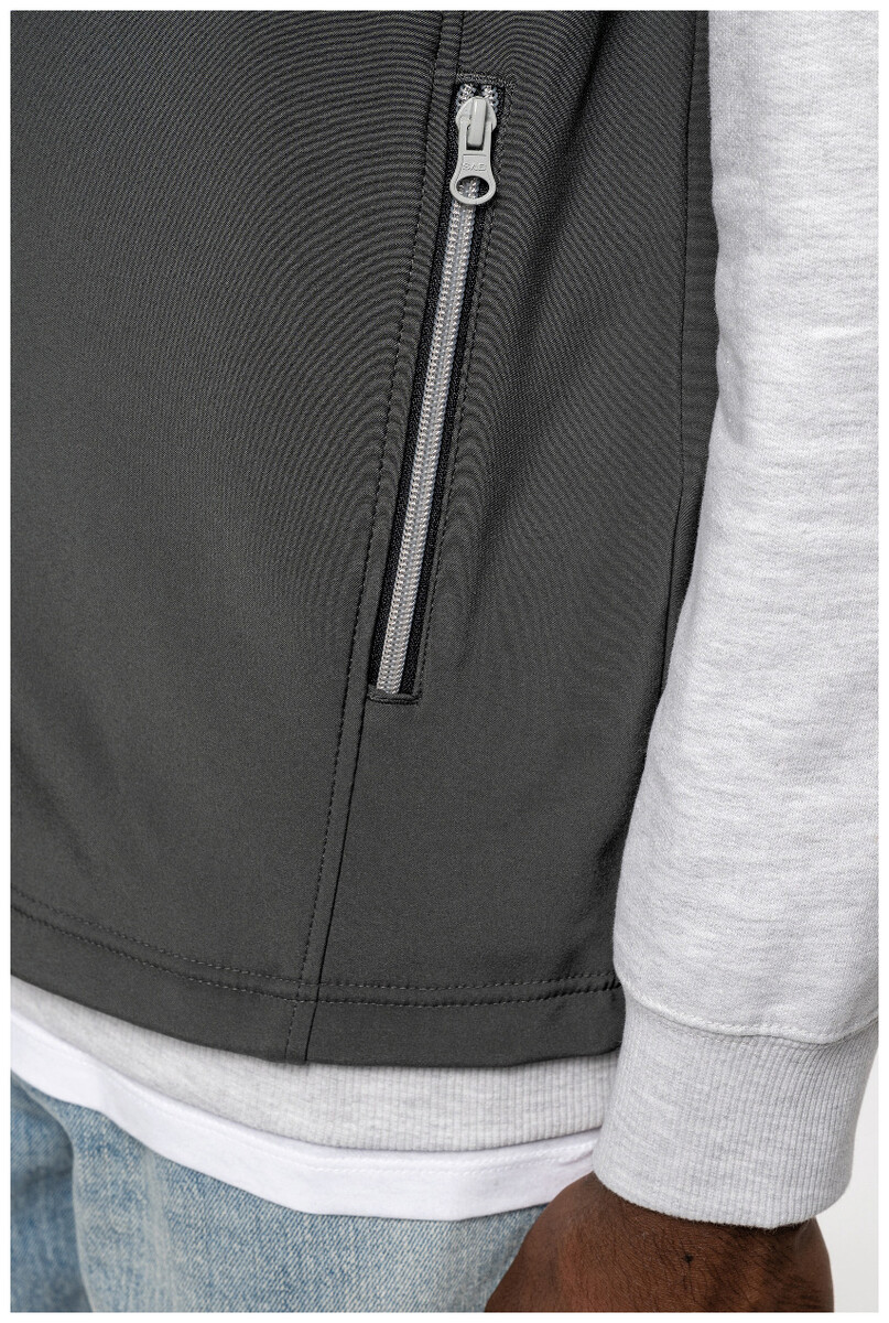 Dvouvrstvá softshellová vesta na zip s bočními kapsami na zip. S kontrastními zipy. Vodoodpudivá tkanina. Vnější strana: 95 % polyester a 5 % elastan. Vnitřní strana: 100% polyester micro polar fleece. 300 g/m2. Výrobek značky Kariban.