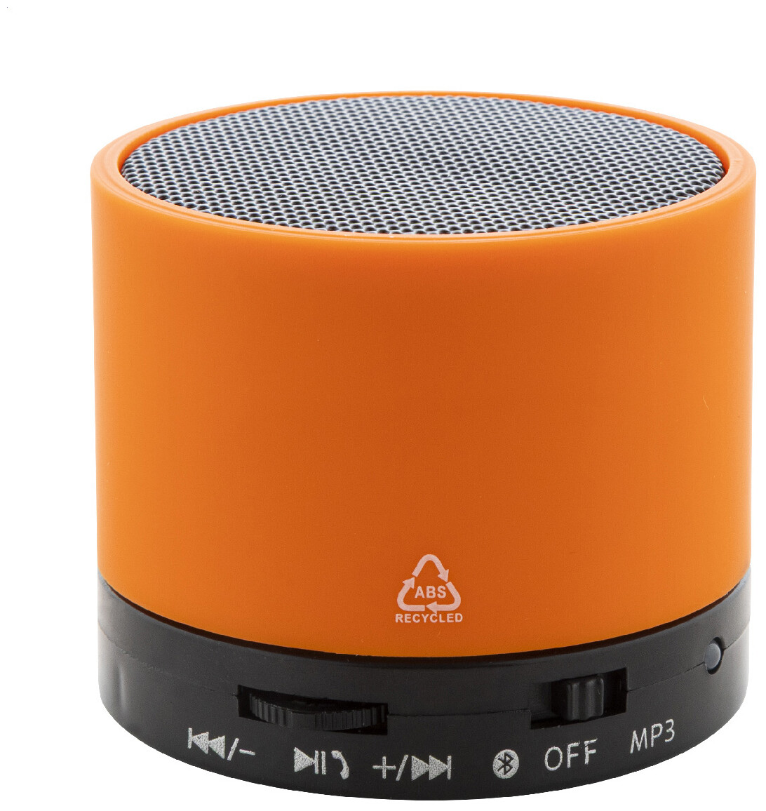 Bezdrátový reproduktor z recyklovaného ABS v pogumovaném pouzdře s kovovou síťovinou a dobíjecí baterií (300 mAh). S funkcí handsfree hovorů a přehrávání MP3 z micro SD karty. Včetně nabíjecího kabelu USB.