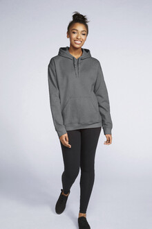 Mikina s kapucí, 80% bavlna a 20% polyester s přední kapsou. 285 g/m2 (bílá 278 g/m2). Značka Gildan.
