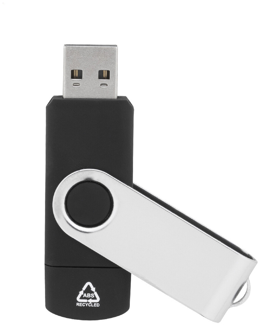 Otočný USB flash disk OTG v pouzdře z recyklovaného ABS a kovu s pamětí 8/16/32 GB. S připojeními USB a USB-C. USB 2.0.
