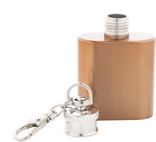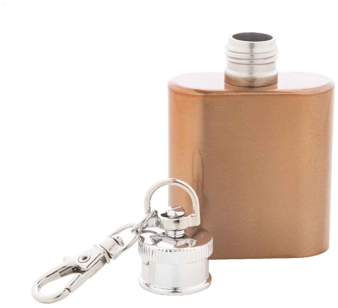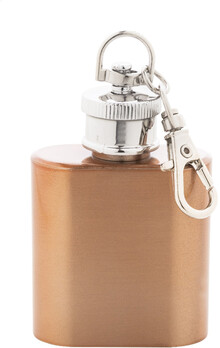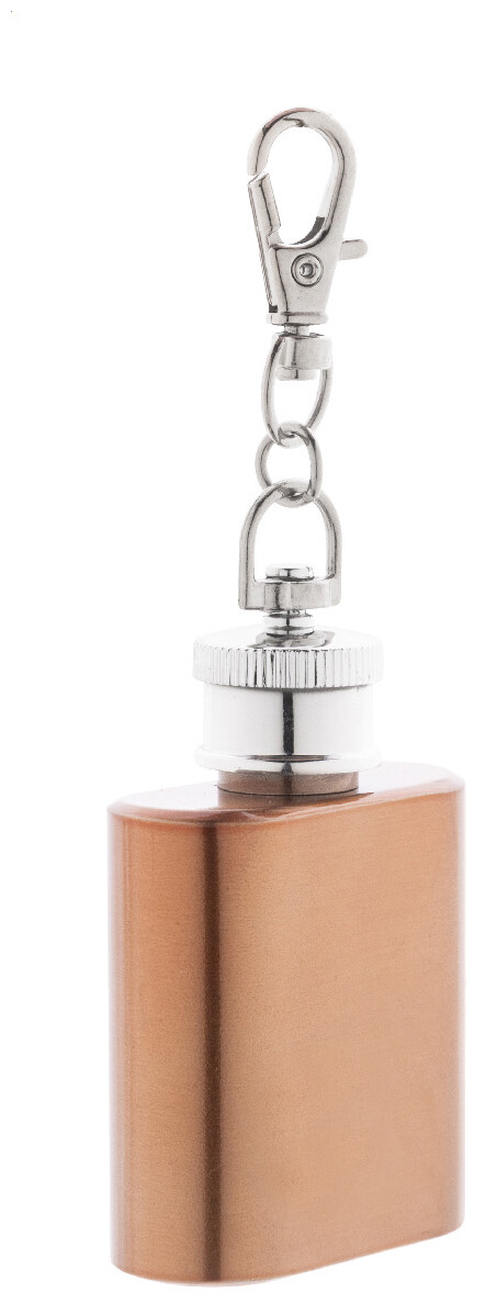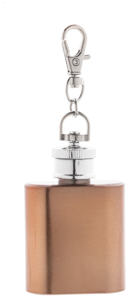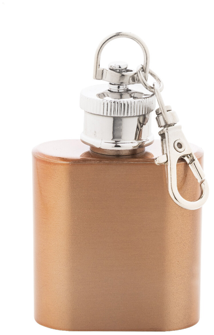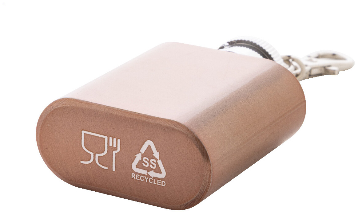 Mini butylka z recyklované nerezové oceli s lesklým kovovým povrchem a karabinou na klíče. 30 ml.