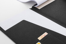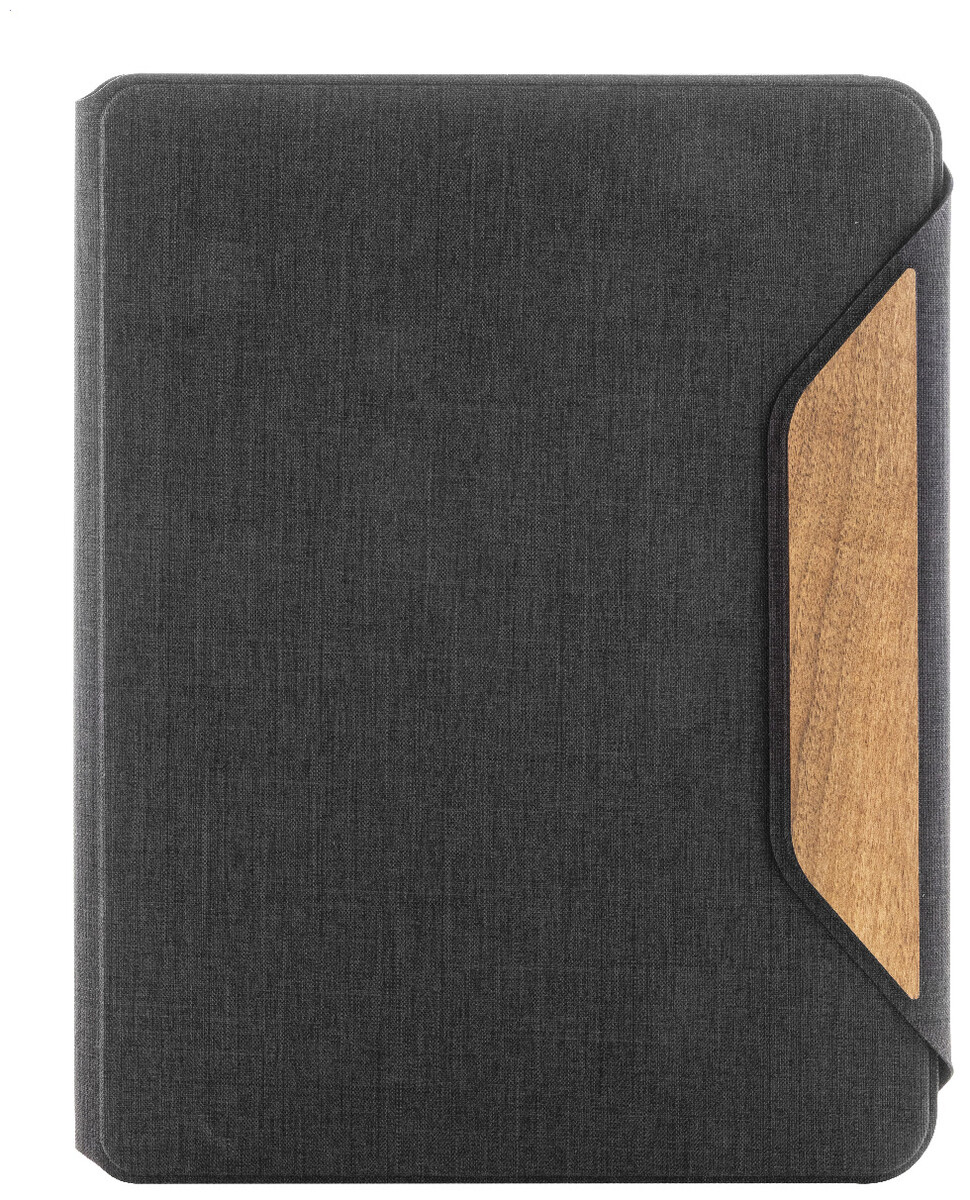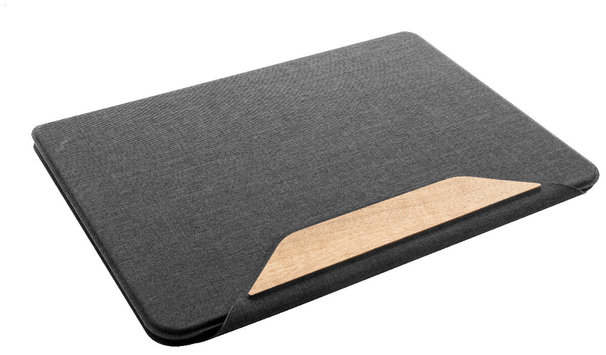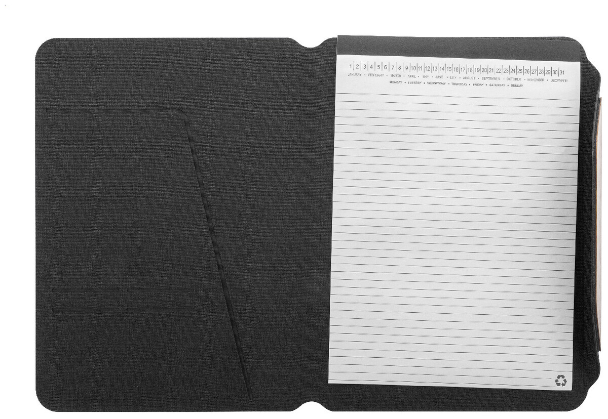 Složka na dokumenty A4 z RPET polyesteru s několika vnitřními kapsami a magnetickým zapínáním s detaily z ořechového dřeva. S linkovaným blokem z recyklovaného papíru s 20 listy.