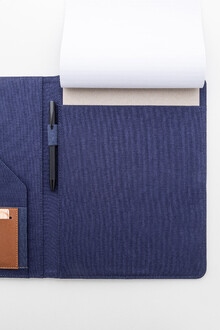 Složka na dokumenty A4 z recyklovaného plátna a recyklované umělé kůže s několika předními a vnitřními kapsami. S blokem na 20 linkovaných listů z recyklovaného papíru. 70 % recyklované bavlny a 30 % RPET polyesteru.