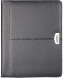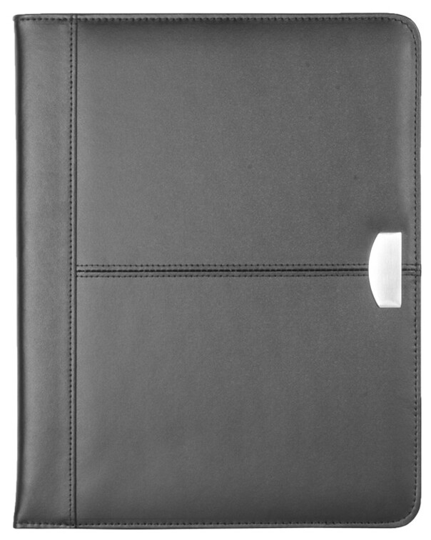 Sloha na dokumenty z černé kůže s kovovým štítkem nahoře, s linkovaným blokem a přihrádkami na dokumenty, vizitky a pera.