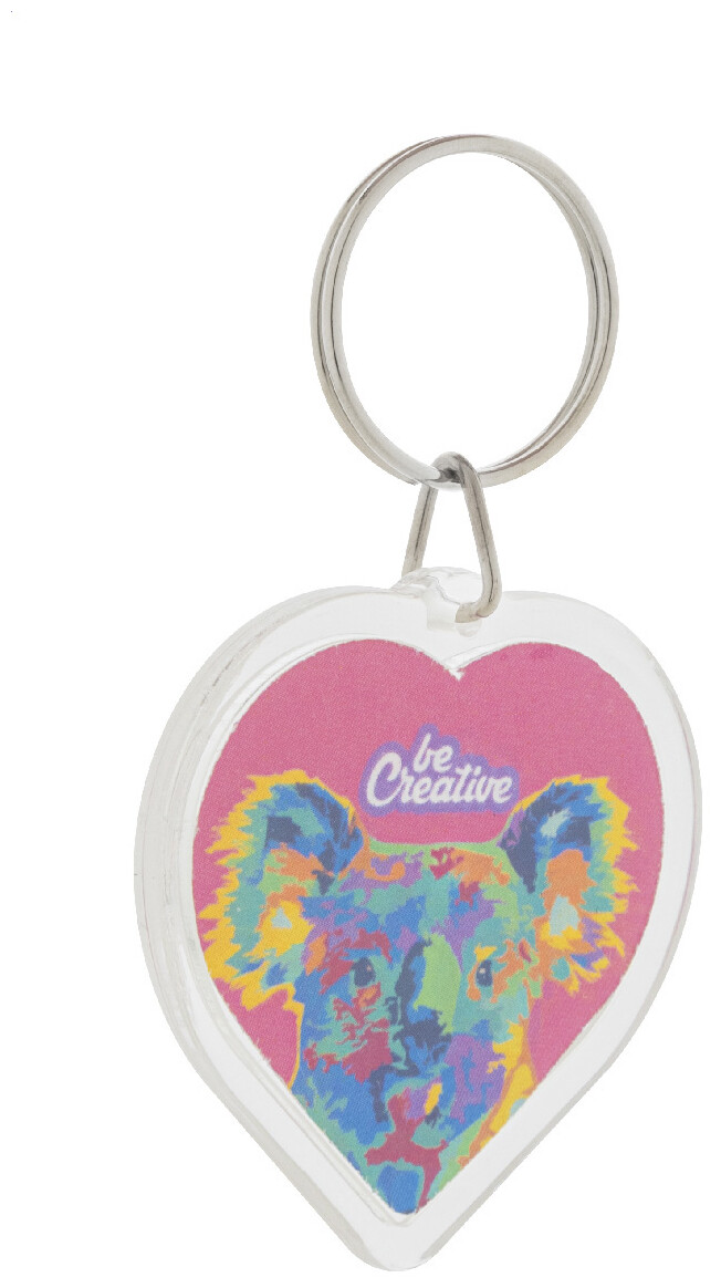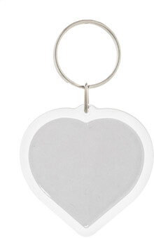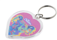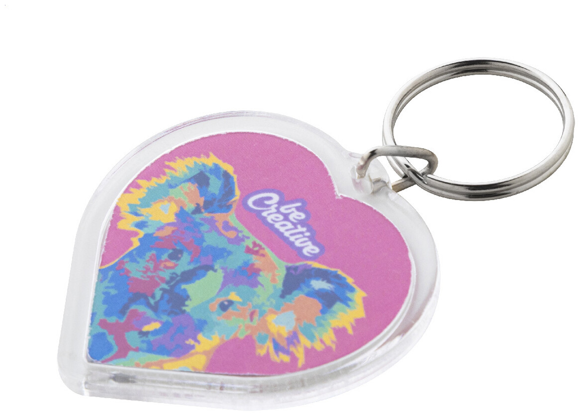 Přívěšek na klíče ve tvaru srdce z akrylu s barevnou papírovou vložkou na zakázku a kovovým kroužkem. Cena zahrnuje digitální tisk na obou stranách, nezahrnuje tiskovou přípravu. Min. mn.: 100 ks.