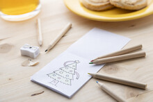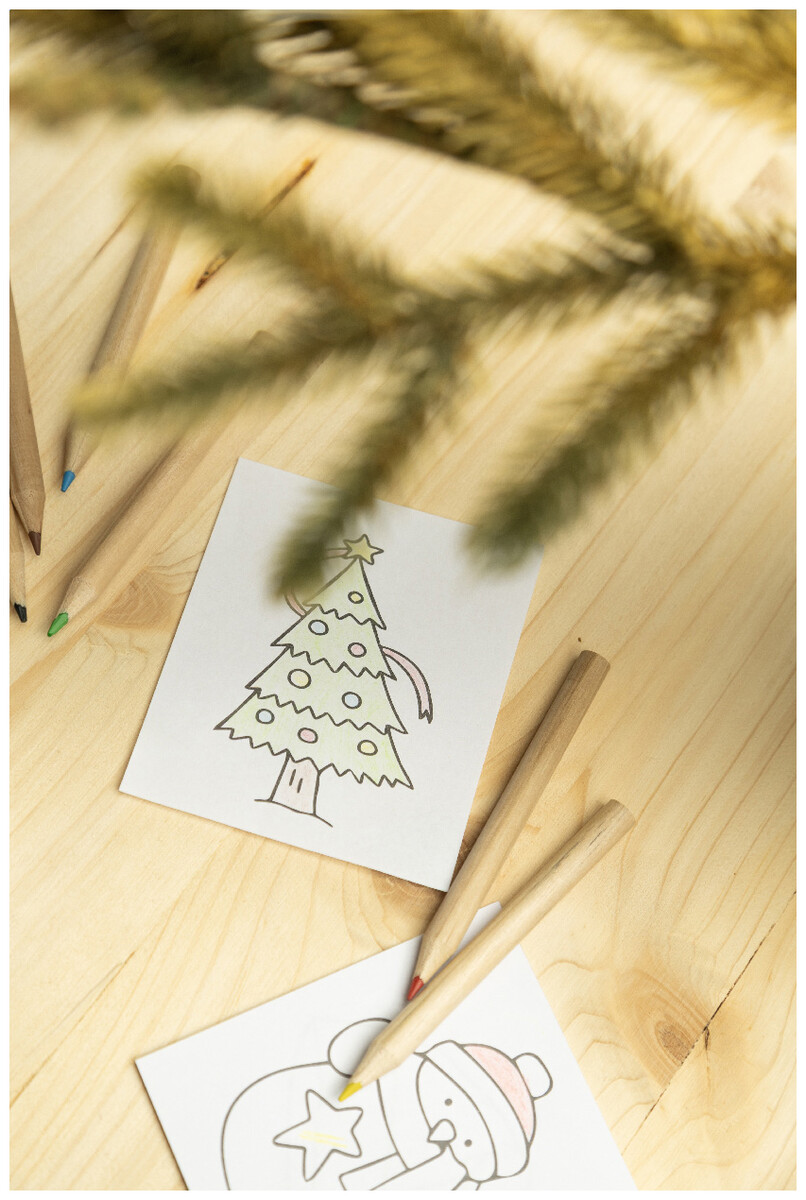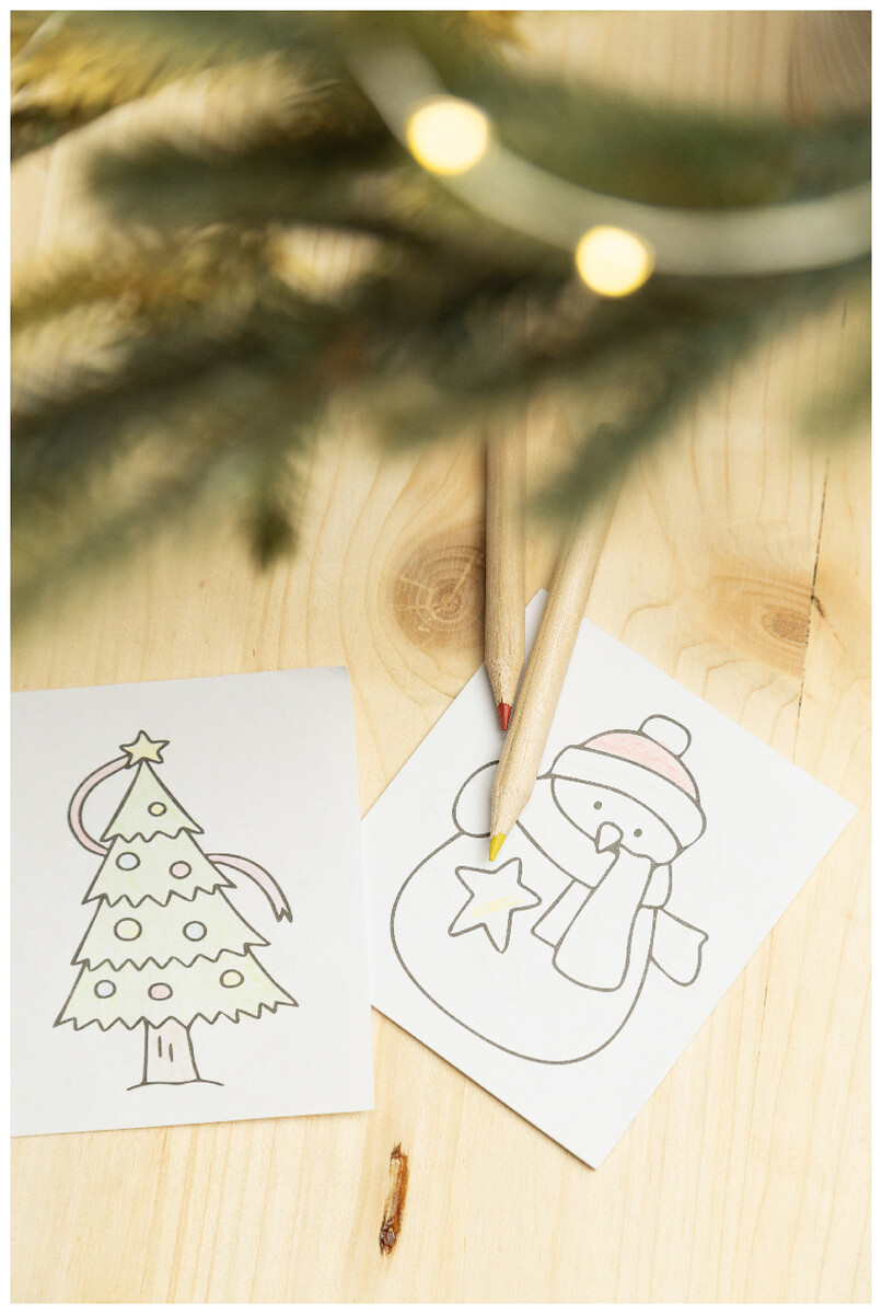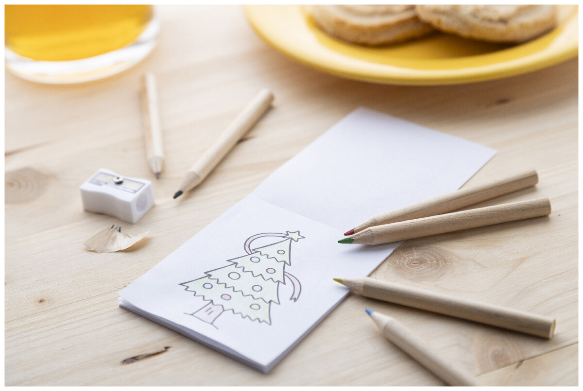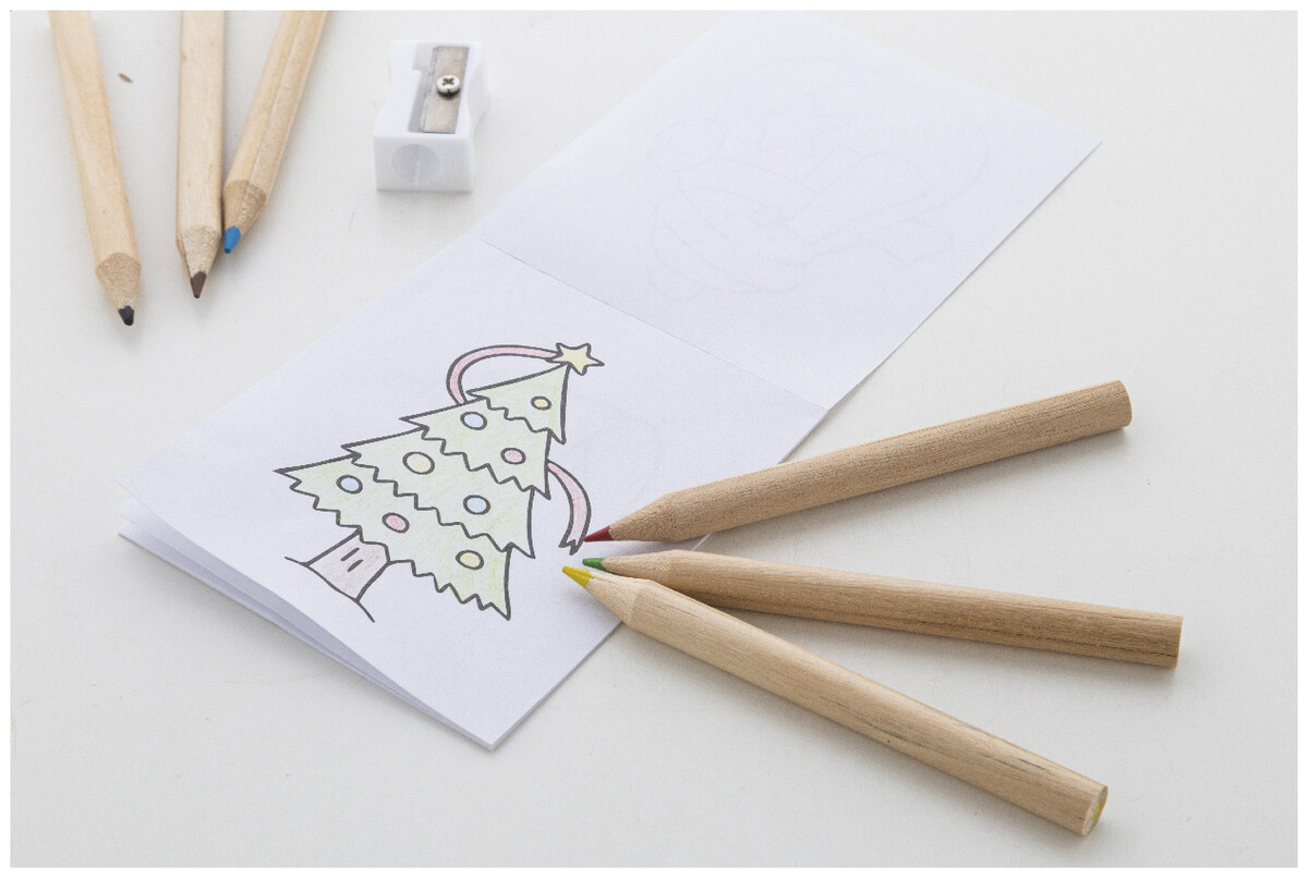 Vánoční sada na vybarvování se 6 dřevěnými pastelkami, ořezávátkem a omalovánkami. V krabičce z kraftového papíru.