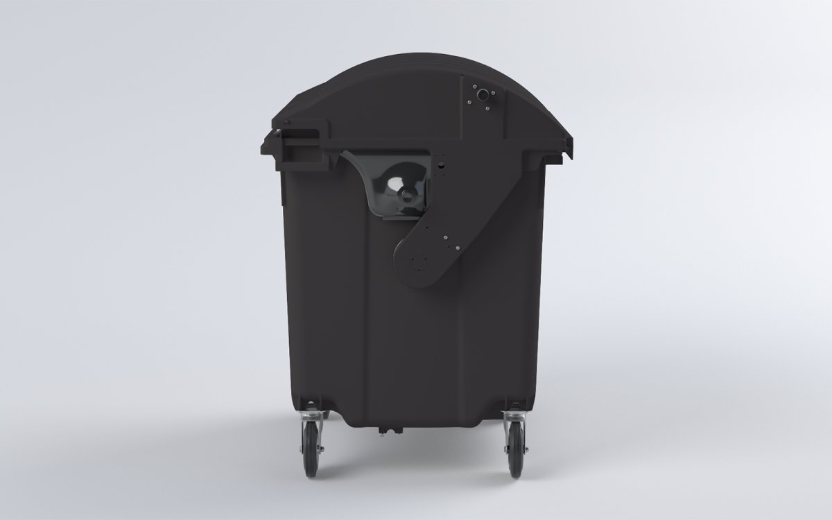 Kontejner s horním výsypem o objemu 1100 litrů je opatřen kulatým víkem.