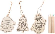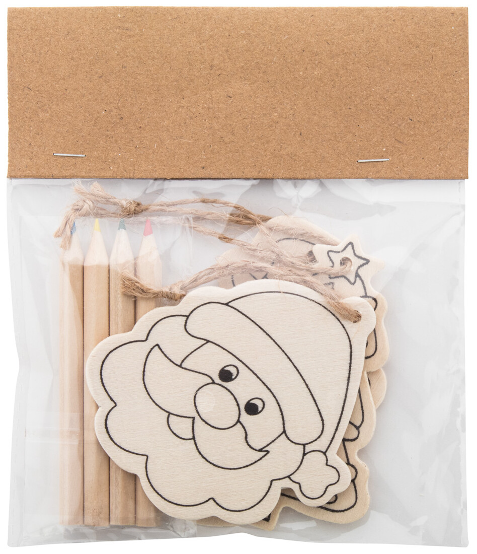 Vánoční ozdoby na vybarvení s kraftovým papírem na obalu. Včetně 3 ks dřevěných ozdob s konopnou šňůrou (Mikuláš, vánoční stromeček a sněhulák) a 4 ks barevných tužek.