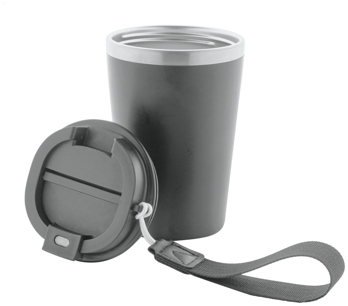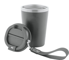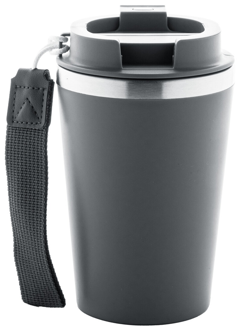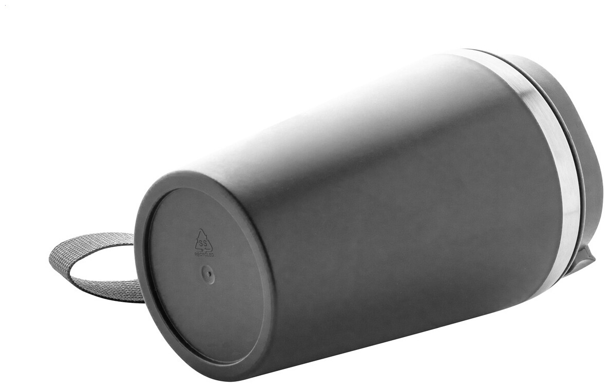 Dvoustěnný termo hrnek z recyklované nerezové oceli s vnějším PP plastem a víčkem na pití. S popruhem na přenášení RPET. 350 ml.