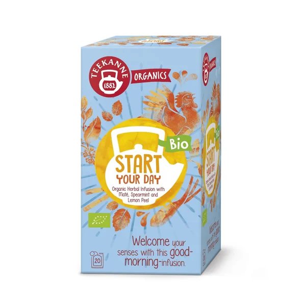 Jemný bylinný čaj Teekanne Organics Start Your Day kombinuje maté, mátu a citronovou kůru, aby vám poskytl osvěžení a nastartoval celý den. Máta a lékořice navíc přispívají ke správnému trávení.